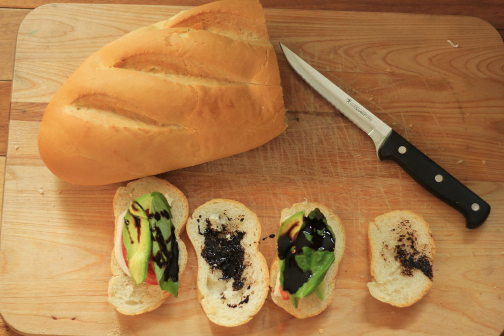- Layer cheese, tomato, avocado and basil onto one slice, then drizzle with blasamic glaze.