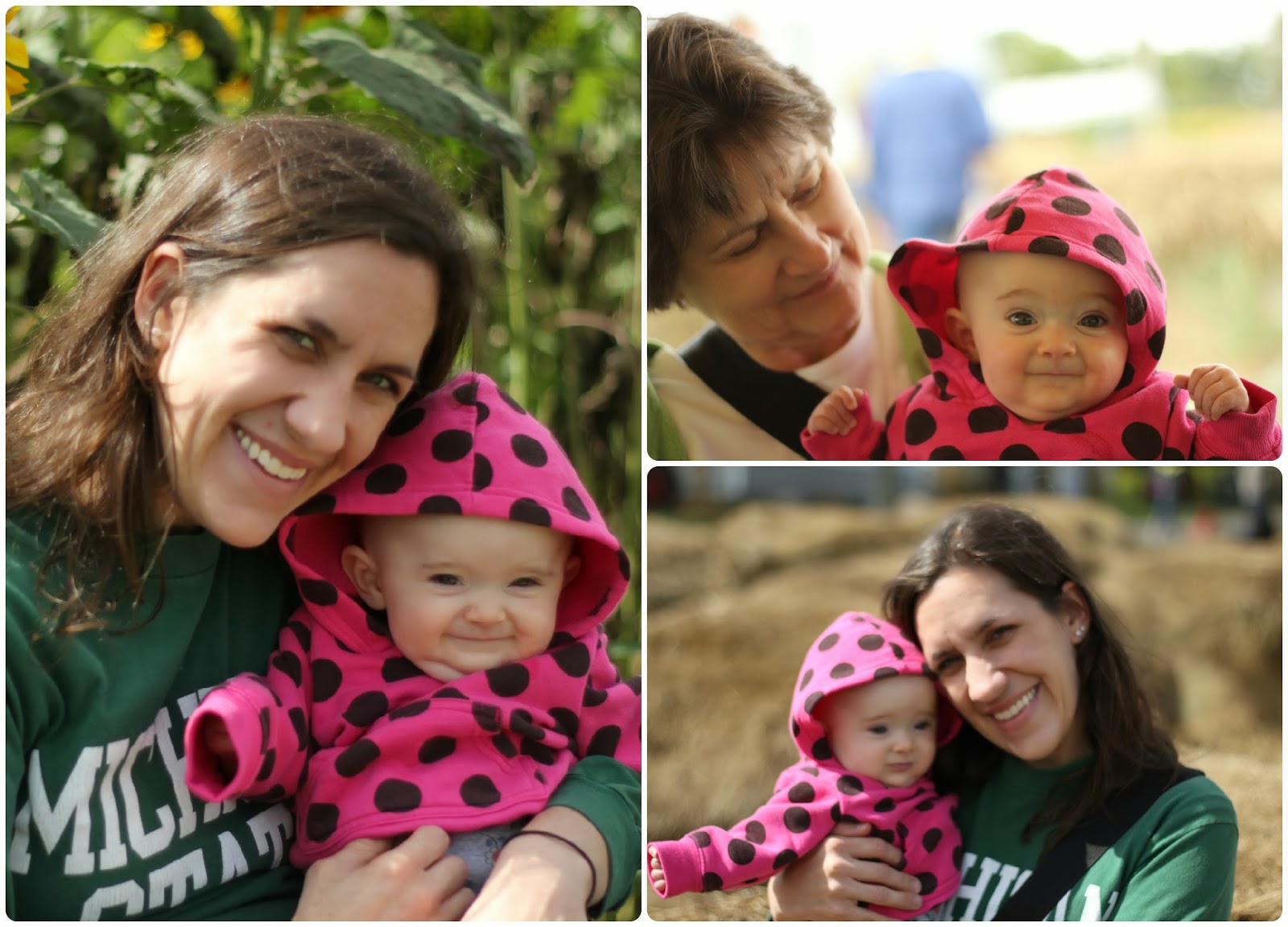 Luckily this year the weather cooperated, and I got to take Annabelle for her first trip to the orchard! I went with my parents on a Tuesday, which was great because it was so empty. No waiting for a tractor and no waiting for cider and donuts. My dad brought a small cart with wheels to carry the apples. Between the two of us we got a bushel of apples. It would have been quite difficult to carry a bag of apples as well as Annabelle. Annabelle actually slept the entire time we picked apples (since she decided that she wasn’t going to take her first nap), but then woke up at the end for cider and donuts (a girl after my own heart). By the way, if you’ve never considered “baby wearing” I highly recommend it (even though every time I tell Matt “I wore Annabelle” he responds “it the puts on its skin”… <<shakes head>>). I am able to do a lot more when I am wearing her and my hands are free. Plus if it close to a nap time, she can easily fall asleep. I use the ergo when going out since I think it has a bit more structure to it, and the moby at home.