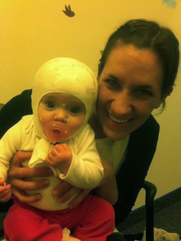 Thankfully our insurance didn’t require much to get approved for the helmet. All we needed was a letter from the pediatrician and then some measurements and pictures from the orthotist. We were able to go in today to get Annabelle’s head scanned so they can make the helmet for her. Before scanning was around they would have had to get a plaster mold of her head. That seems like it would be quite dramatic and I am thankful things have changed! In order to get scanned Annabelle had to wear a white cap with reflectors all over it (I used my non-smart phone to take a picture. Hopefully I can get it on my computer soon, it’s being difficult today. I will post it when I can. I think she looks kinda cute).