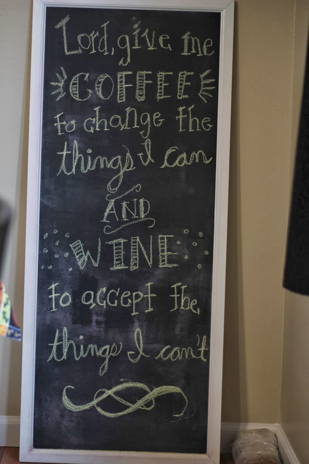 When I was pregnant with Annabelle, I did a chalk board every week to show my pregnancy progress. I got the idea from Jessica over at Little Baby Garvin. Now that I am not pregnant any more, it has been sitting collecting dust. Until I found a quote on pintrest, and decided that it needed to go on the chalk board, and that the chalk board needed to go in the kitchen. Matt got home from work, and asked “what is the chalkboard doing in the kitchen?” I informed him that as soon as we got the china cabinet moved back, it was getting hung up. He didn’t seem particularly thrilled 😉 I’m looking forward to changing the quote out.