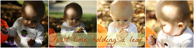 Fall pictures! Annabelle had to take her helmet off for a bit (it caused some bruising at the back of her head because of too much pressure… poor baby girl). I used that time to take some pictures of her outside in the leaves. I mean, I’m going to take tons of pictures of her with the helmet, but it’s nice o be able to see her head! It was the first time she ever played with a leaf, and I think she was really wondering what on earth it was!