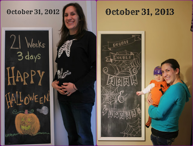 I hope that everyone is enjoying their Halloween so far. It is rainy and windy here (so a typical MI Halloween), so we will not be going out trick-or-treating. Hopefully Annabelle will be up to help pass out some candy, but we shall see. I can’t believe that last year I was pregnant with Annabelle. Now we are celebrating Halloween with an almost 8 month old! Where did the time go?! Here is a picture of Halloween last year, and Halloween today. I love my little pumpkin so much!