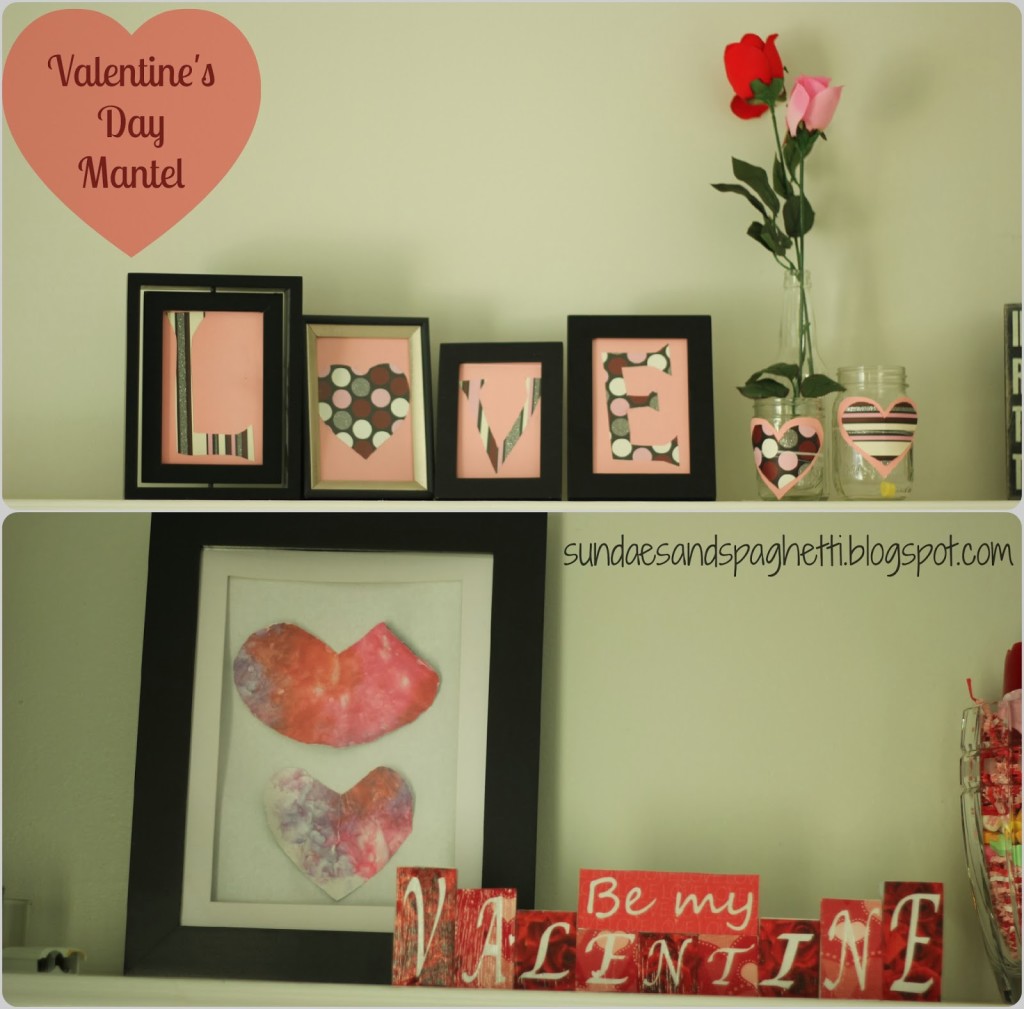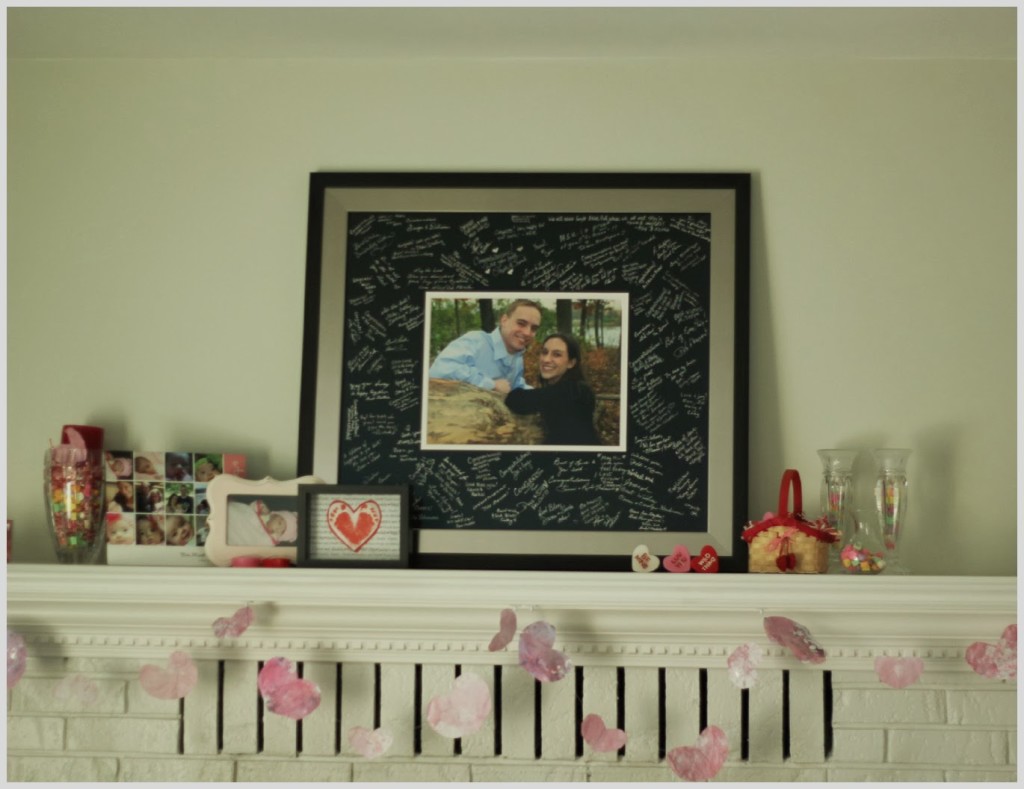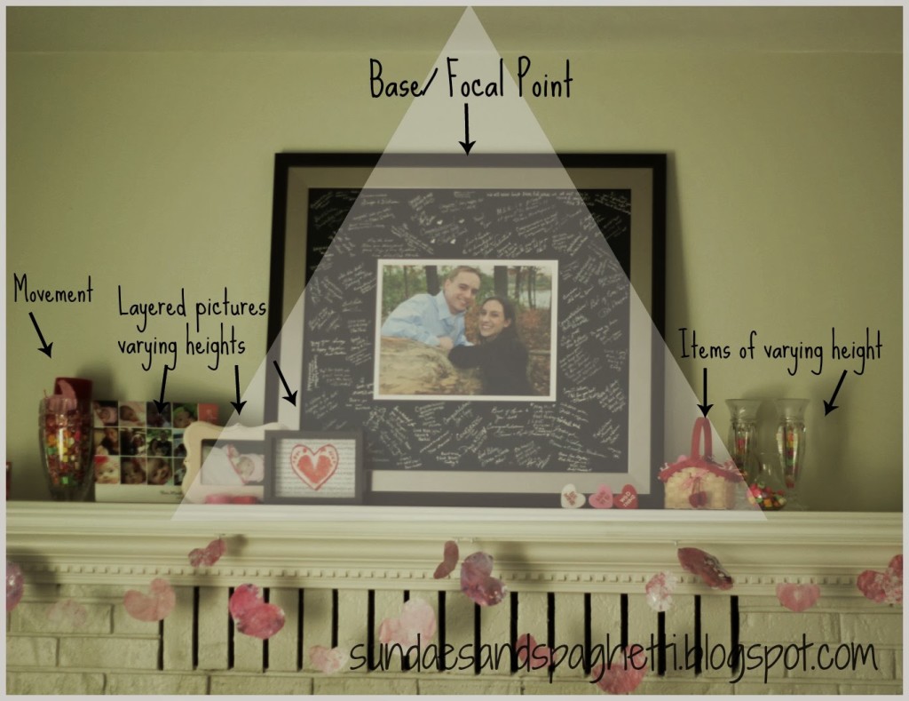 I totally meant to post these pictures before Valentine’s Day, but since life got in the way they are a bit late. I have been struggling with decorating my mantel. I was looking up ideas online and there was all this talk about making a “triangle”. There should be a base in the middle then items of varying heights/some movement (i.e. a candle) on either side of the base piece making a visual triangle. My problem is that my mantel is way to long for that. It spans the entire wall (15-20 feet perhaps, I’m to lazy to measure it right now). So I tried to use the triangle concept by create three separate visual areas. The middle then one on either side.