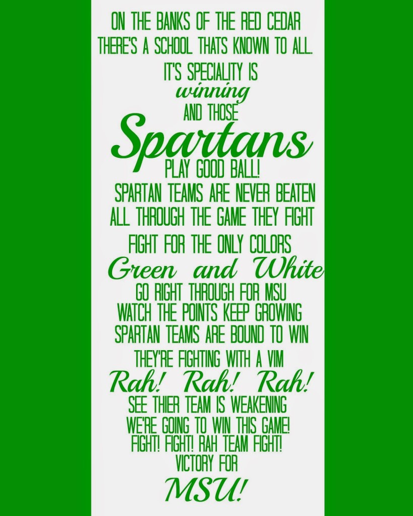 #1: I created a graphic of the MSU fight song in PicMonkey. Our printer decided to run out of color while I was printing it, but we haven’t had a chance to replace the ink yet, so I put up the two toned one.