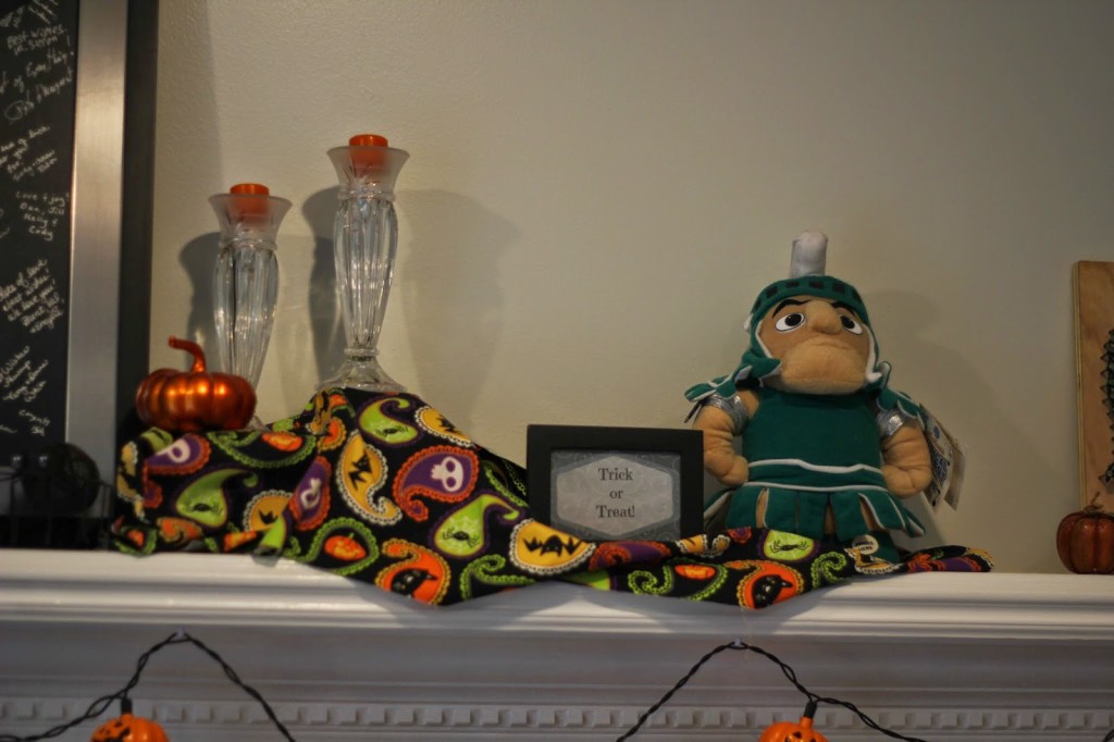 I love fabric (as it apparent by my box full of fabric that I have yet to use). My love for fabric gets worse around the holiday season. I picked up a few yards of Halloween fabric, but haven’t done much with it. I finally got around to finding a use for it. Some I used on the mantel. I draped over boxes to create some levels. I really like how it looks, and am thinking about picking up some Christmas fabric to do the same.