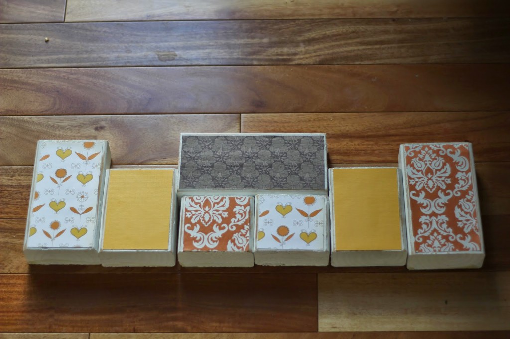 Cut your scrapbook paper and glue onto the blocks (I used rubber cement). I cut the scrapbook paper just a bit smaller than the block of wood. Here are the sizes I used: