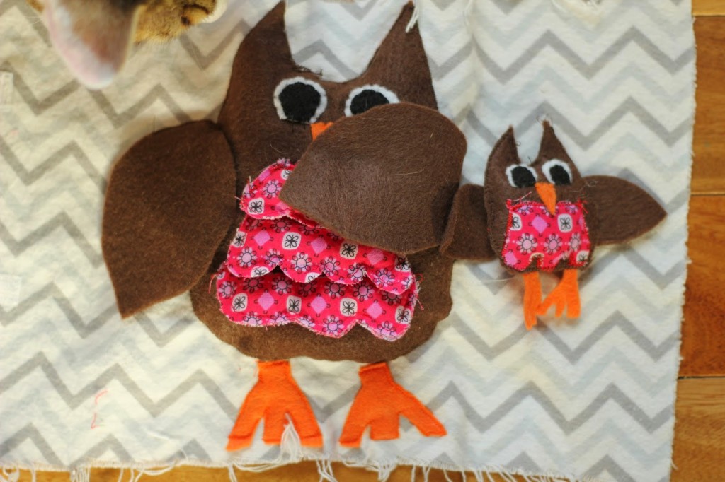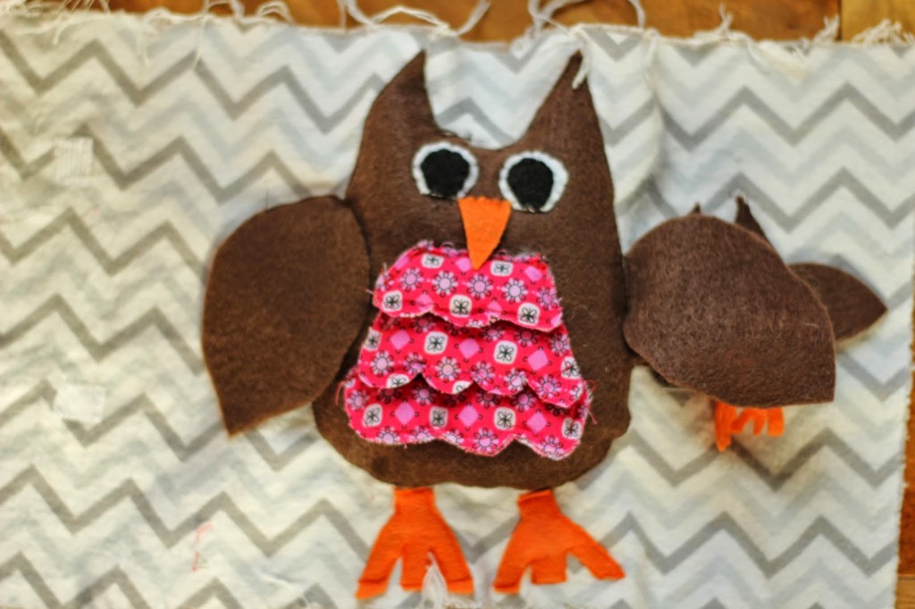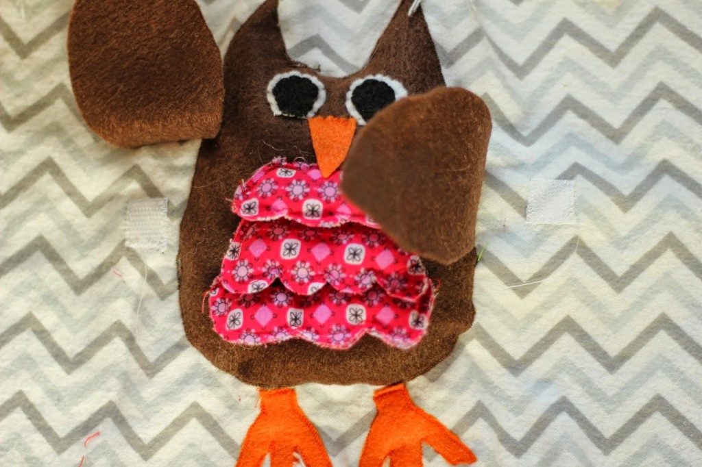 To make the baby bird I basically made a smaller version of the mom. I cut out a front and back for the baby owl as well. I only used one piece for the stomach, and attached the feet and wings directly to the owl. I also put a piece of Velcro on the back of the owl (hopefully the finished product will make these directions make sense). I then sewed the front and back together using a zig zag stitch and stuffed the owl.