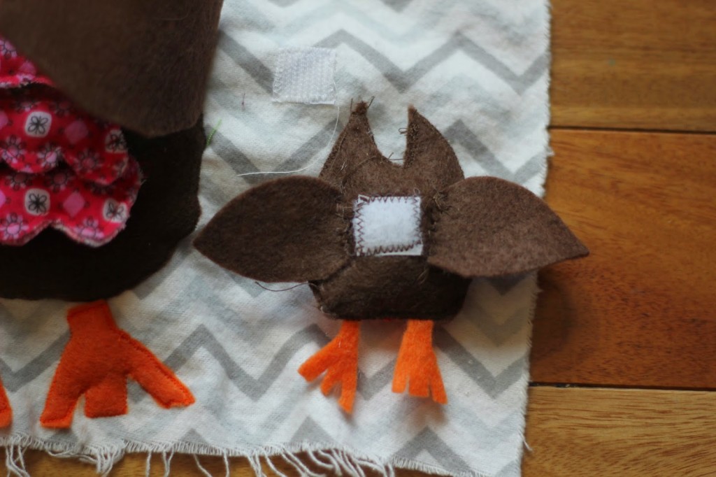 Under each of the wings attach a piece of Velcro (opposite of what you put on the baby bird) so that you can attach him (or her) under the wing of the mom.