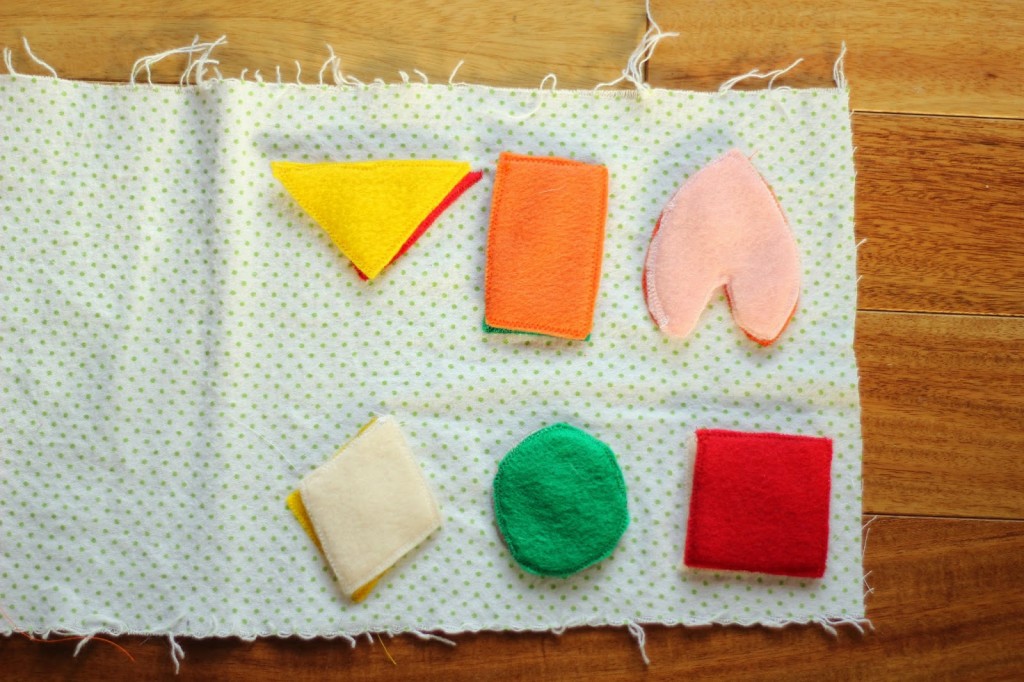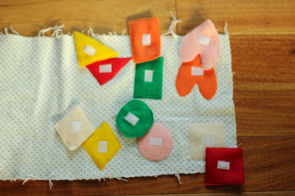On whatever page is opposite sew pieces of velcro to attach the shapes to. I am planning on adding squares of fabric so that the opposite page can be a color match.