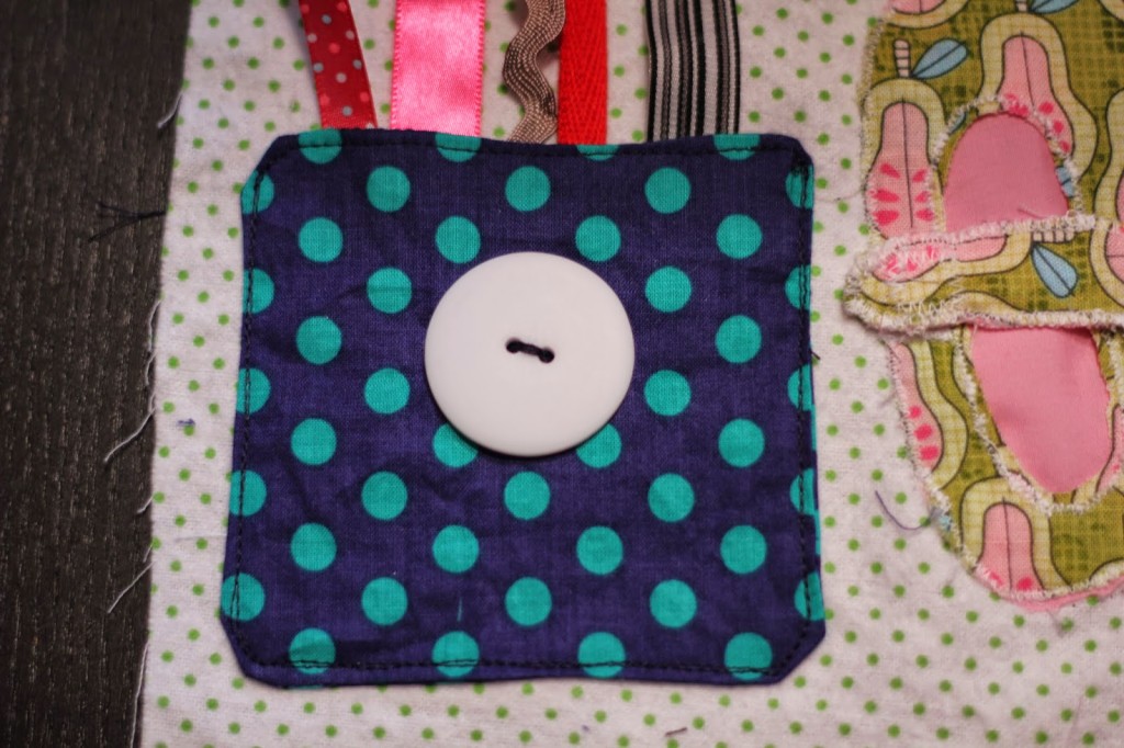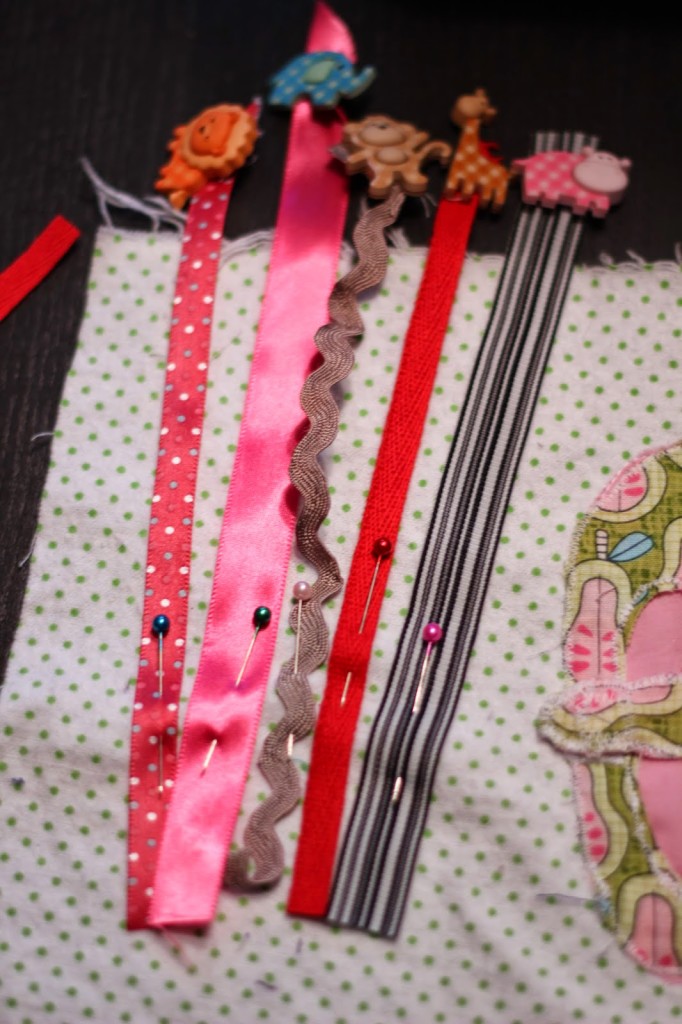 Then pin the other end of the ribbons onto the page of the quiet book. You are going to stuff them into the pocket so your little one can take them out when they open the pocket. The ribbon helps insure they won’t get lost.