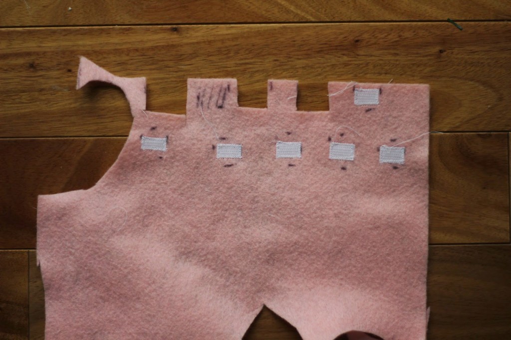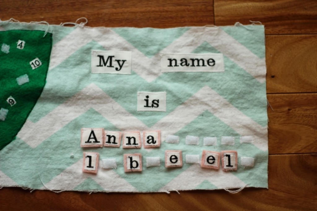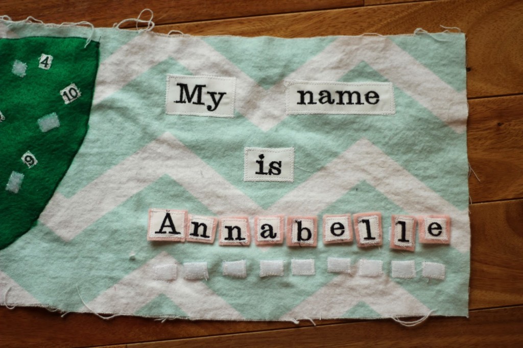 Then attach two rows of velcroe (opposite of the velcroe on the letters you made). The number of velcroe squares will depend on how long your child’s name is.  Since Annabelle is 9 letters long I made two rows of nine squares.