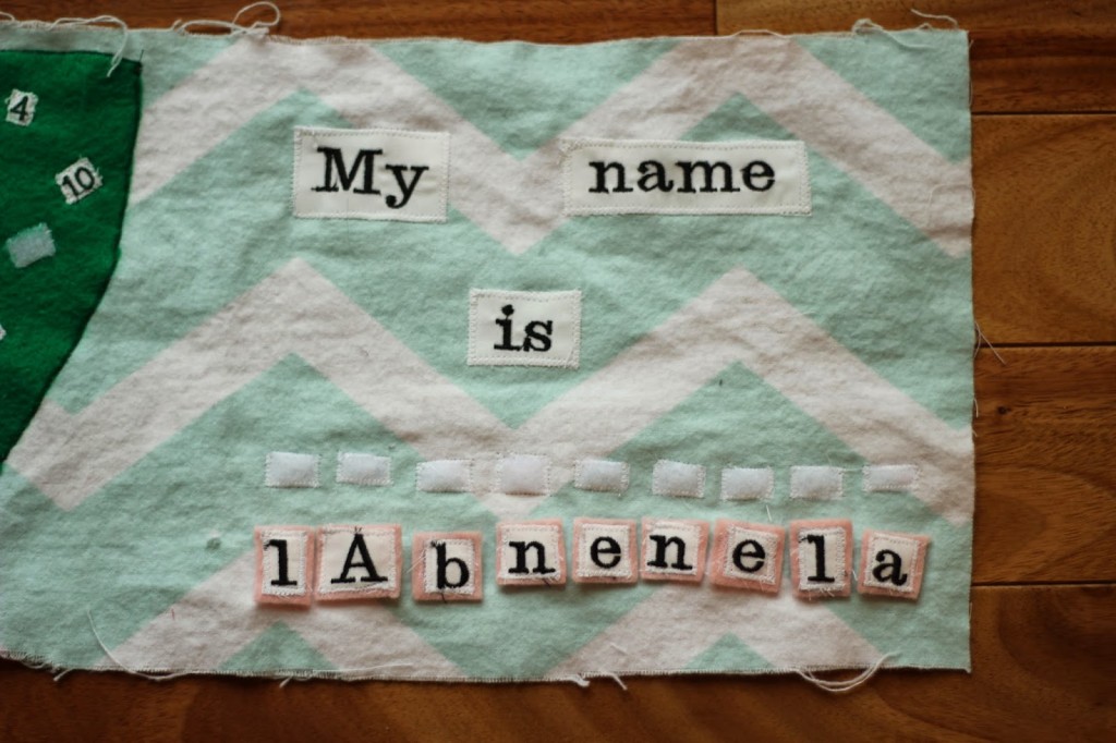 Take the felt with velcroe on it and zig zag stitch a letter onto the opposite side of the felt.  When you are done you will have a letter with a piece of velcroe on the back.