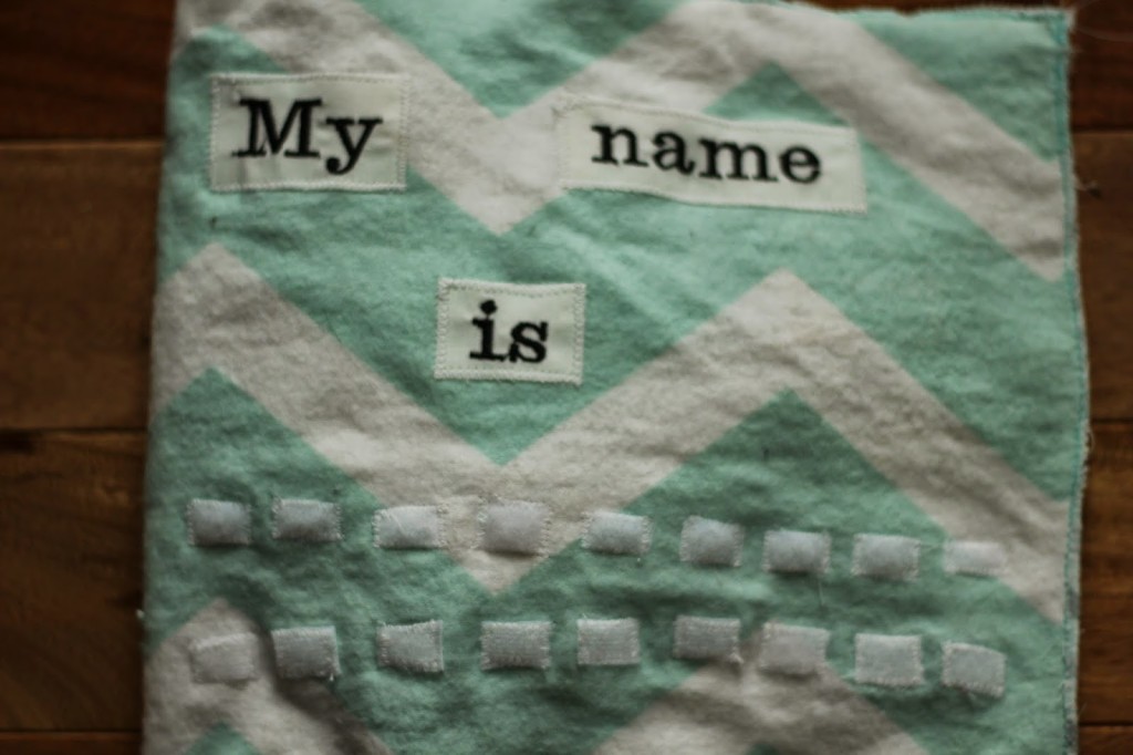 Embroider the letters and the words “My name is” onto white fabric.  If you don’t have an embroidery unit, you can probably buy cloth letters, or use puffy paint or fabric paint.