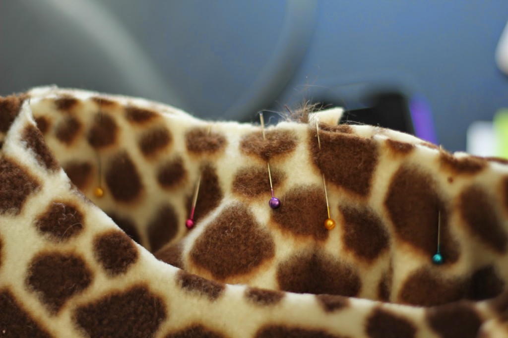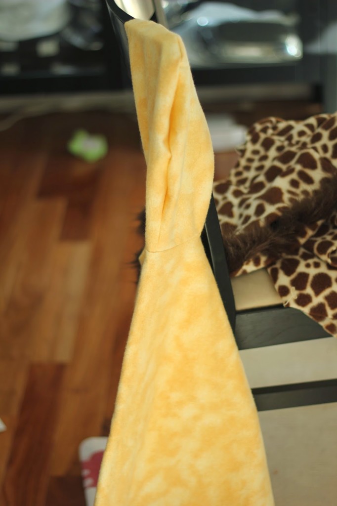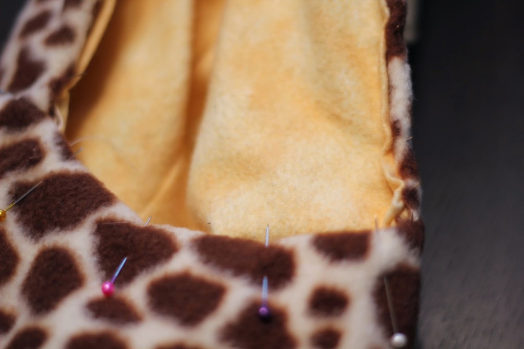 There are a lot of steps to this, so stay with me! In these directions the giraffe print is the outer fabric and the yellow fabric is the lining.