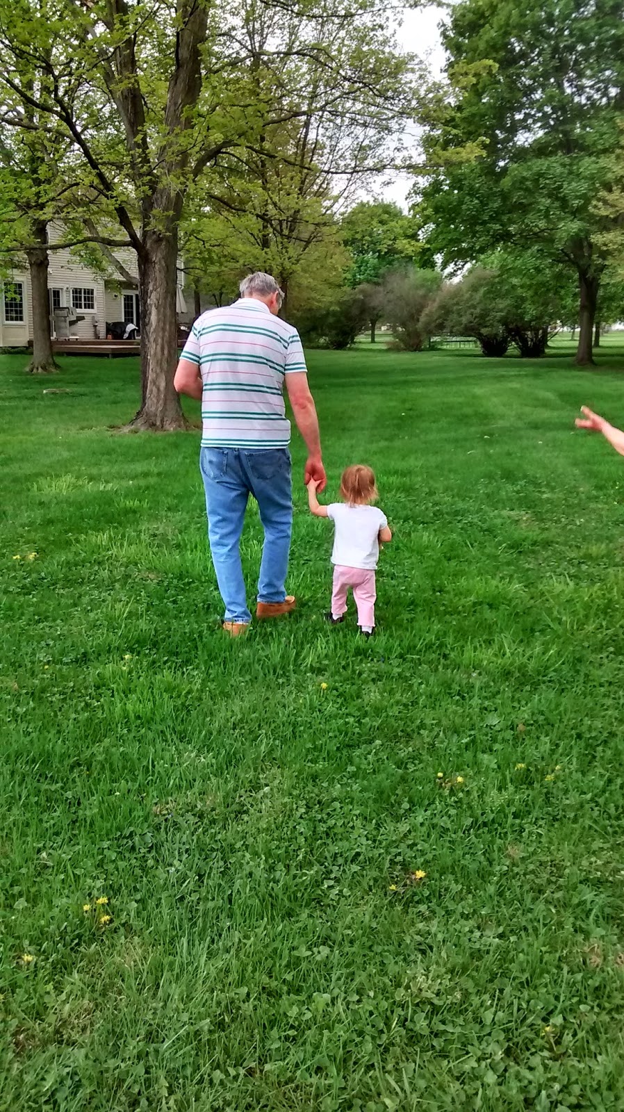 We went to my parents on Friday to celebrate Mother’s Day. We went on a little walk in the common area behind their house. Here she is walking with Papa. What you don’t see is that she is also carrying two stuffed cats.