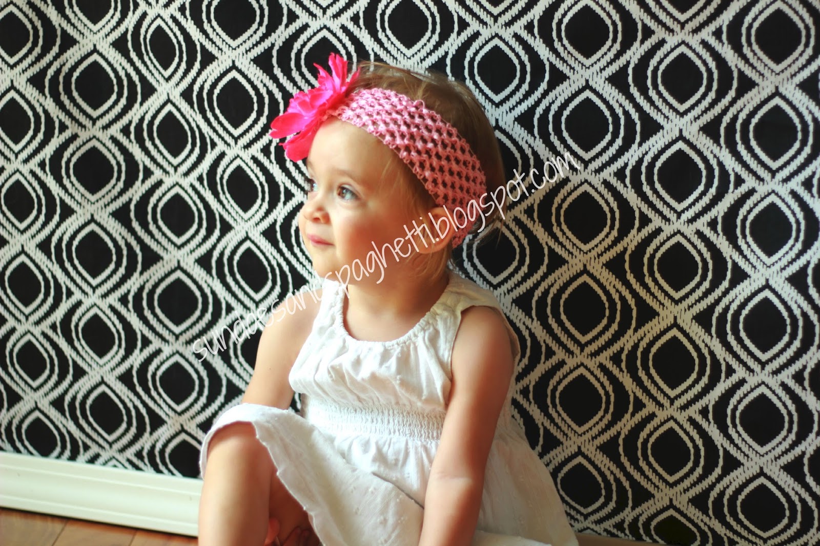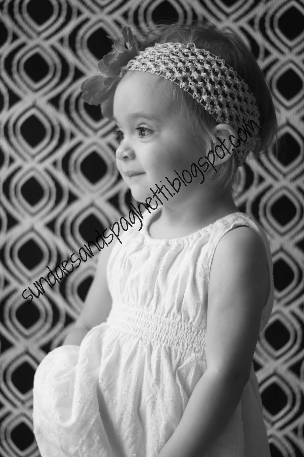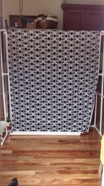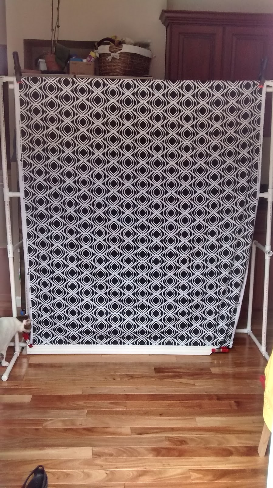 And here it is with a backdrop I made. Easiest thing ever to sew! I just made two pockets, one at top and one at the bottom so that I can slip a pvc pipe through it. As you can see I left the selvedge edges.