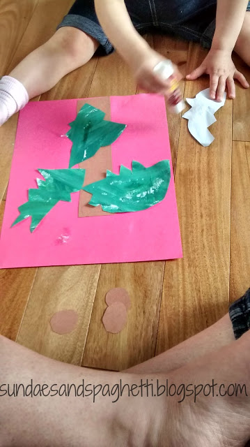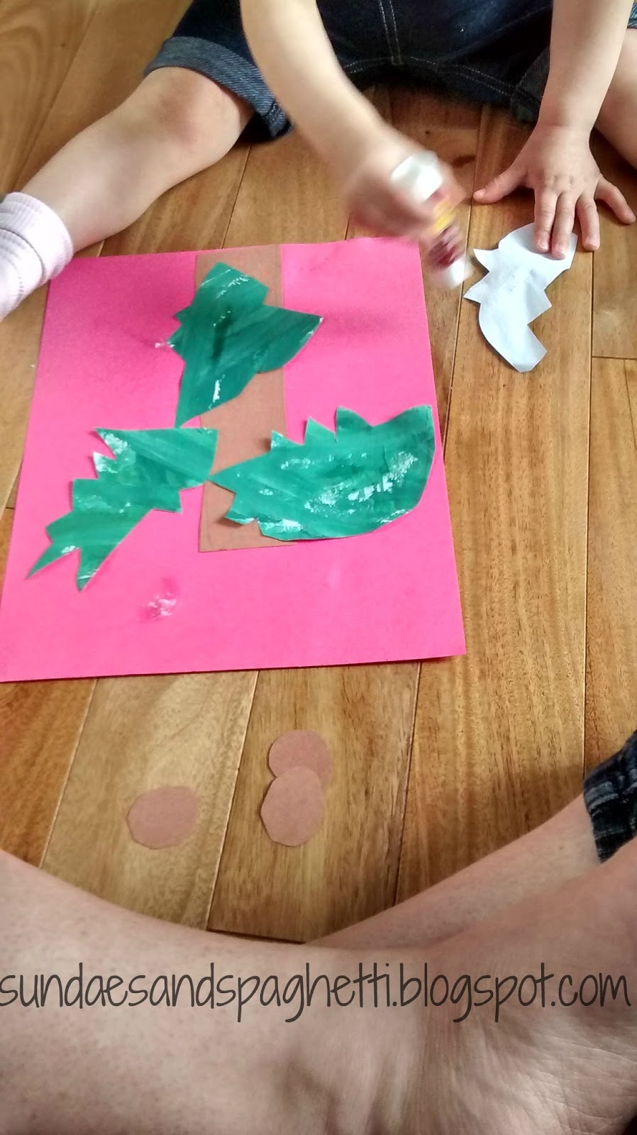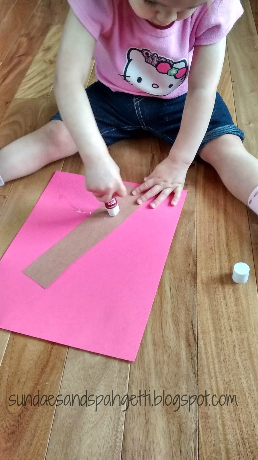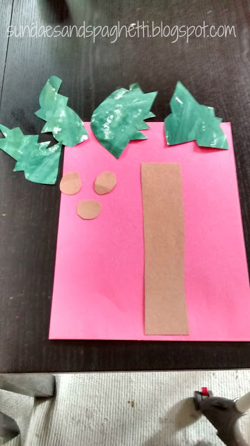 After everything is cut out, allow your child to glue everything to the paper. I chose pink paper, since it looks like the cover of the book.