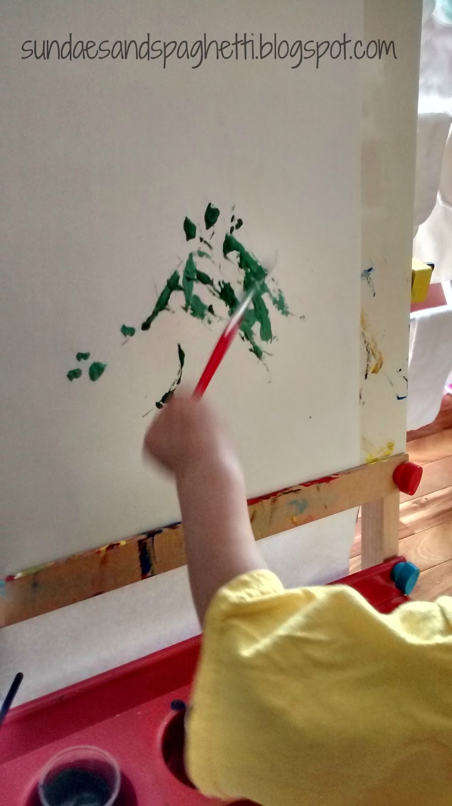Then, after the paint was dry, I cut leaf shapes out. If you have an older child, allow them to cut out their own leaves. I also cut out the tree trunk and some coconuts.