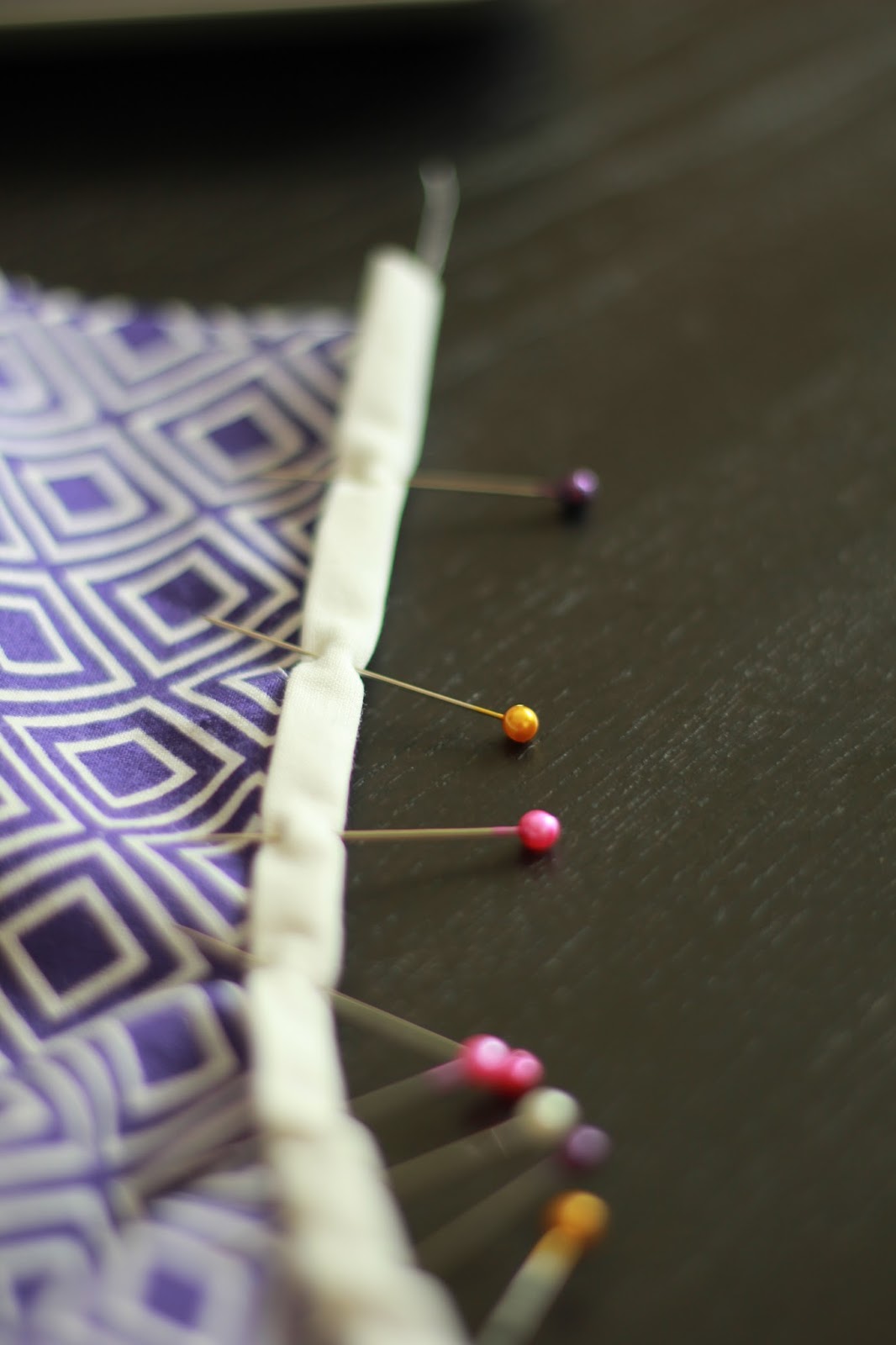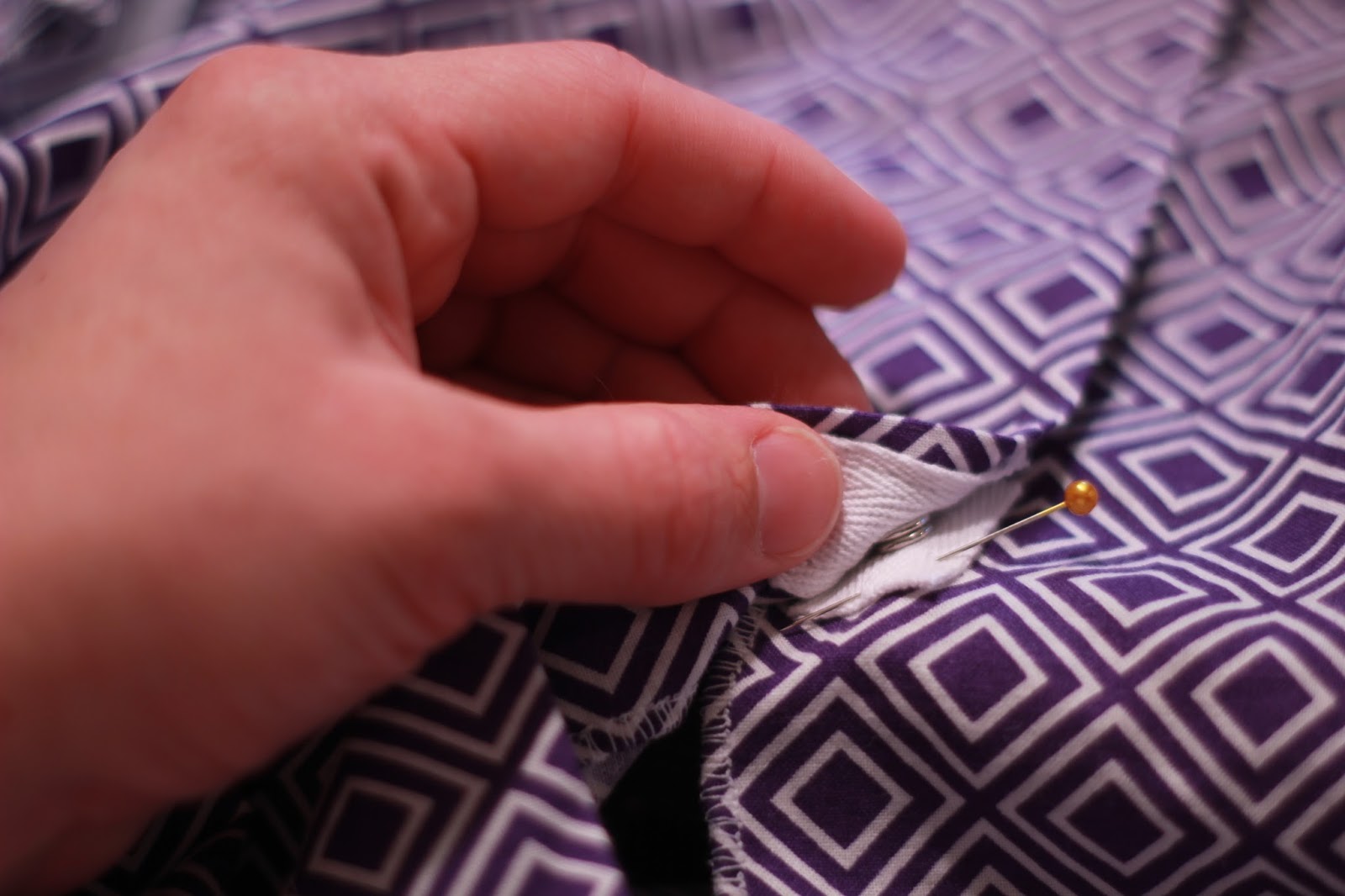 C: Next up you will need to pin the binding to your gown. Be sure to pin to the wrong side of the gown.