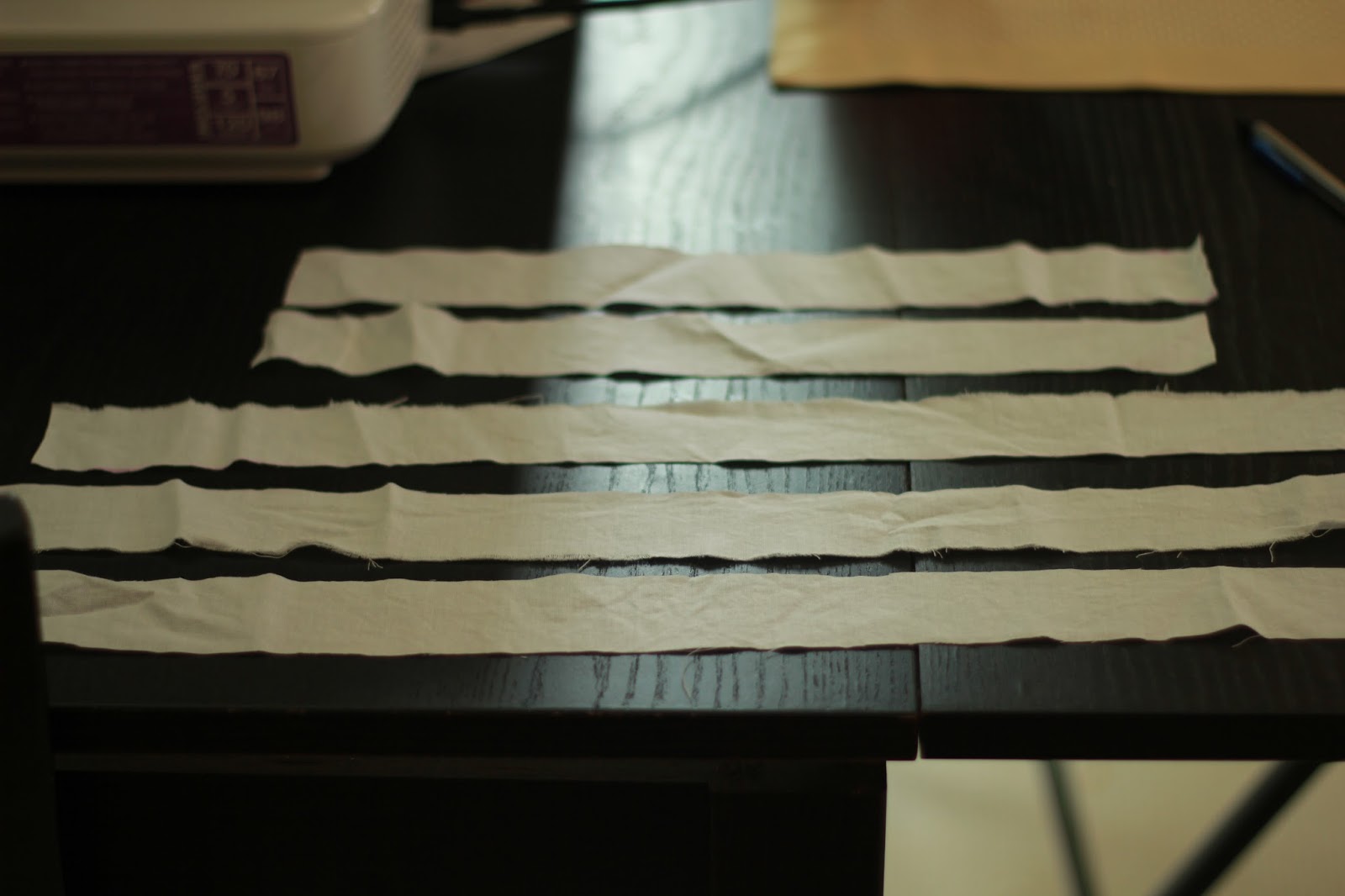 A: Cut five strips of fabric, 1.5″ wide, and however long your measurements are. We are going to be making our own bias tape basically.
