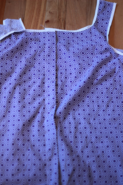 Now it’s time to bind the armholes, neck line and back of the dress. To do this you need to measure each arm hole, the neck and the back of the dress. You should end up with 5 measurements.
