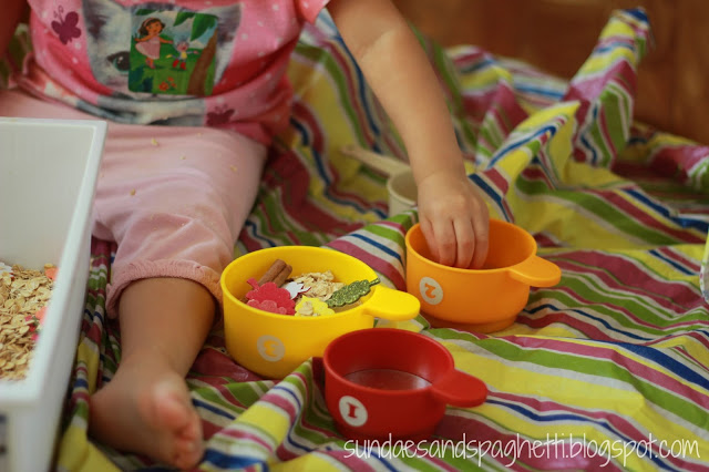 She has measure cups that we use with the sensory box as well. I’d love for her to sort the leafs into the right colors, but she has more fun taking handfuls of oatmeal and putting that in them.