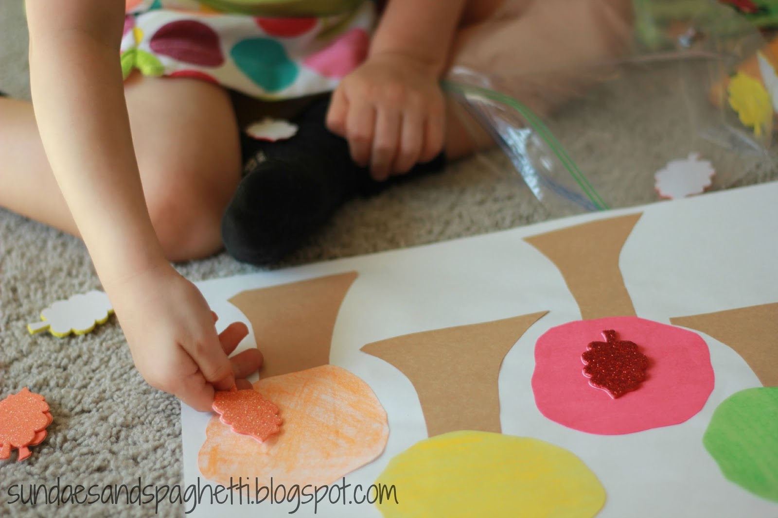 Lastly we did a “leaf sort”. I just made a quick mat with trees on it, then used some of the leaves from the sensory box to create a matching game. Really easy. Annabelle really didn’t get into this as much. I hope to eventually count the leaves after she has sorted them and talk a little bit about more and less.