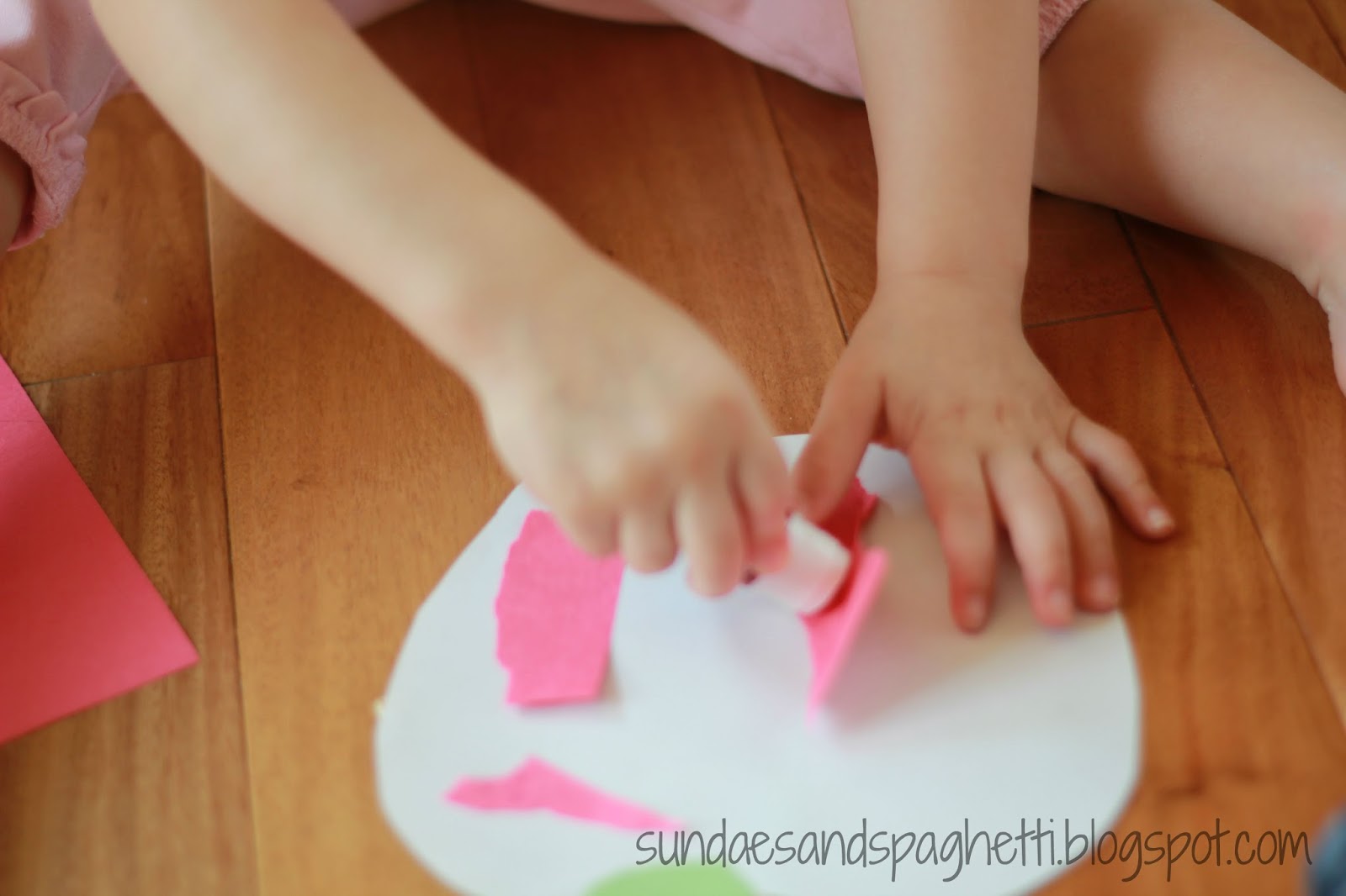 We also did a rip art activity. For those of you unfamiliar with what this is, it’s super easy! You simply give your child some construction paper and have them rip it into small pieces. Then glue those pieces onto some sort of shape.