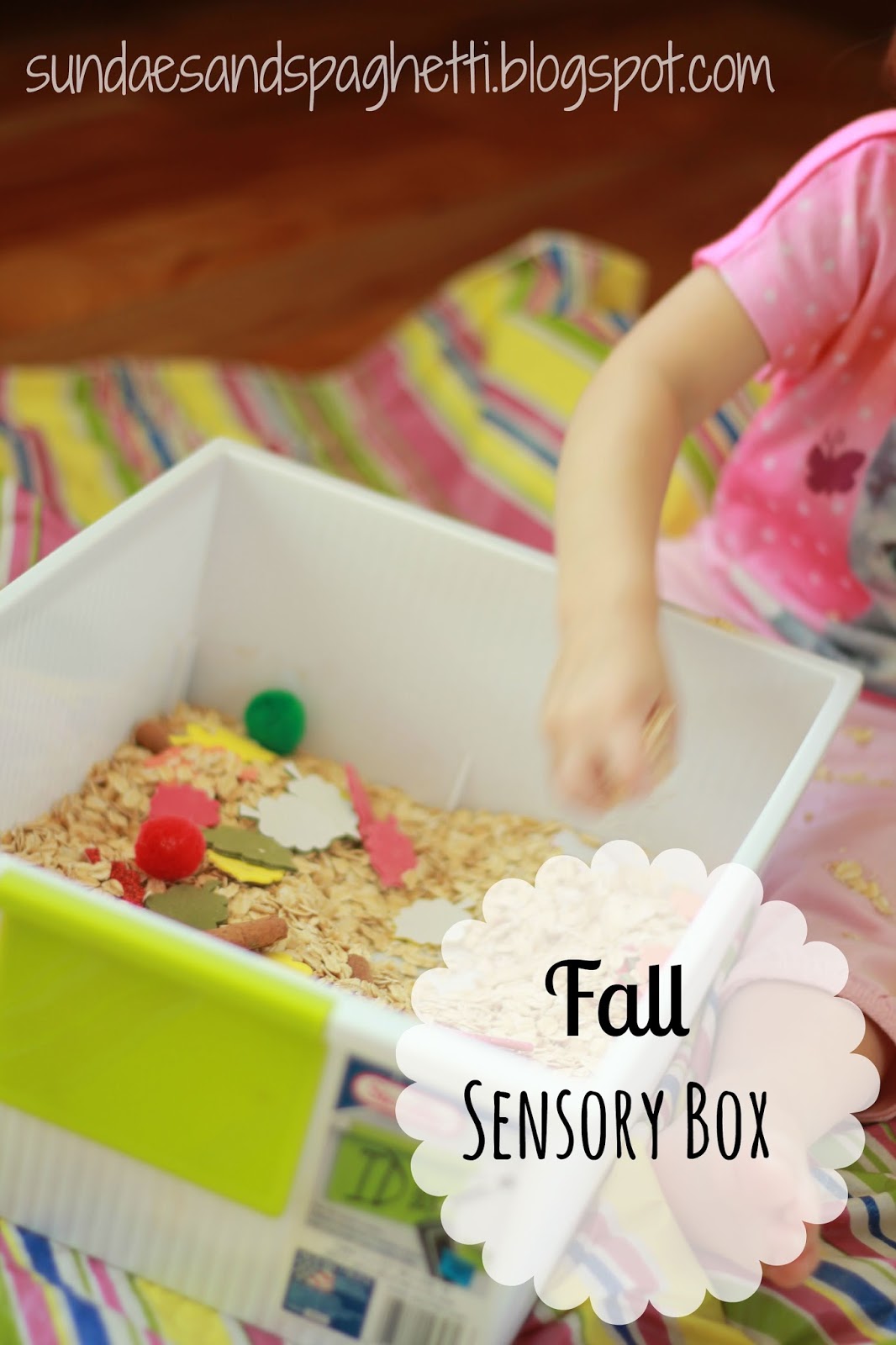 So far Annabelle has loved the sensory box. It is filled with oatmeal, cinnamon, allspice, nutmeg and cinnamon sticks. I also added some foam leaf stickers I got at JoAnn. I’d like to add some fake apples as well.
