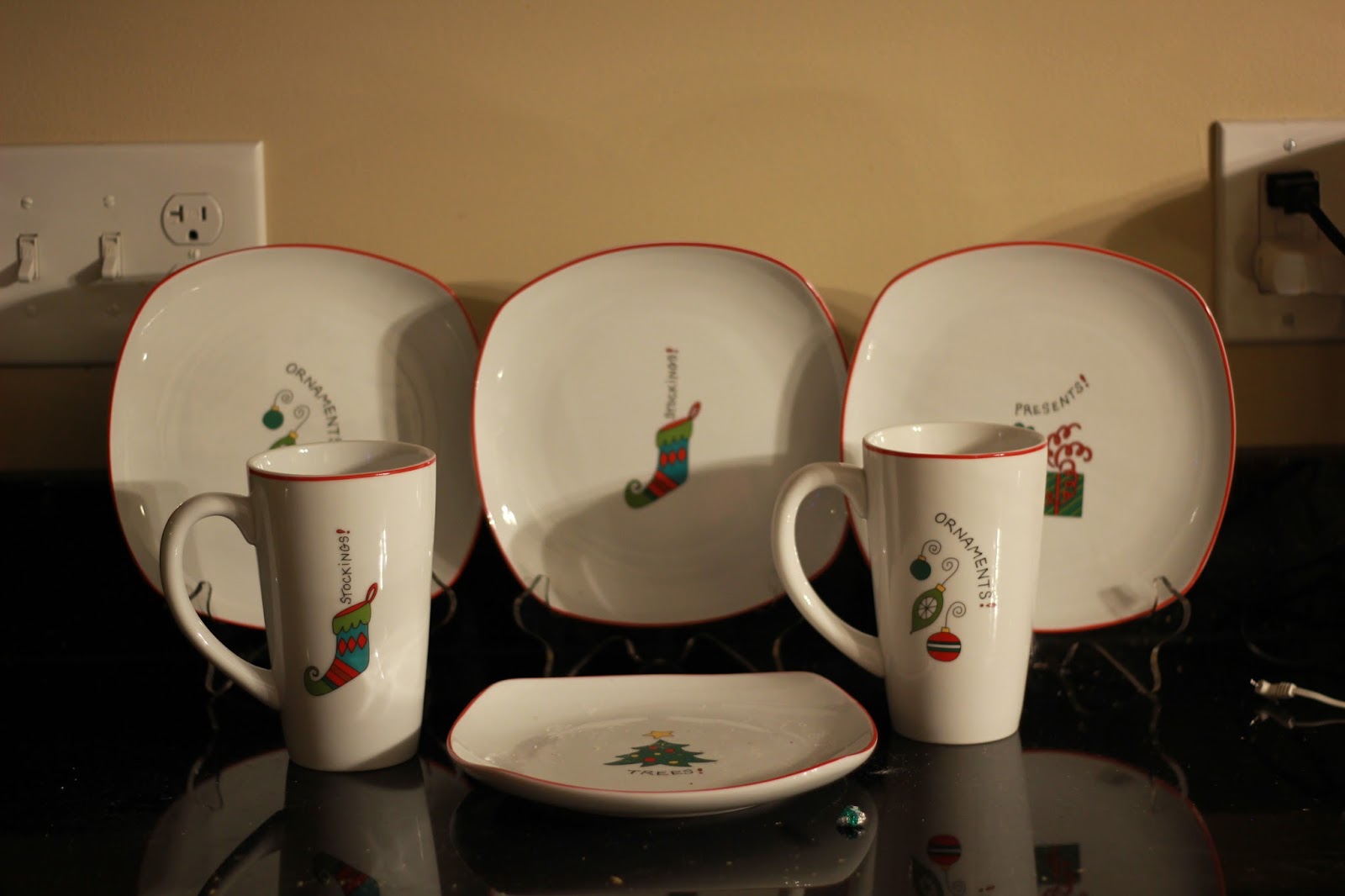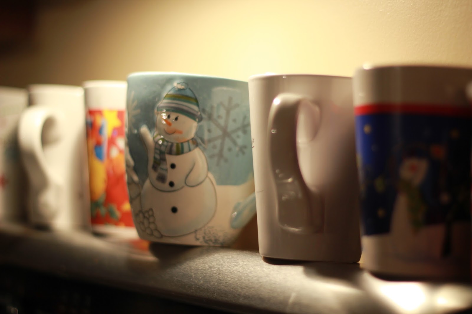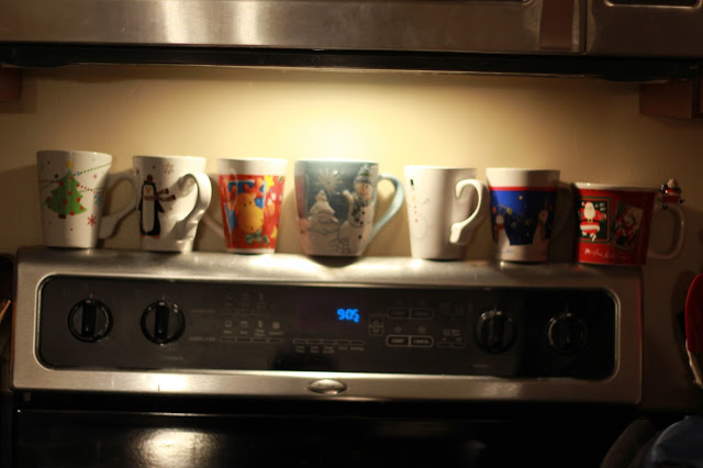 We like to display holiday mugs on the stove. As a former teacher I have way more mugs than fit on top of the stove (mugs with hot cocoa are big gifts). I try to change up the mugs year to year.