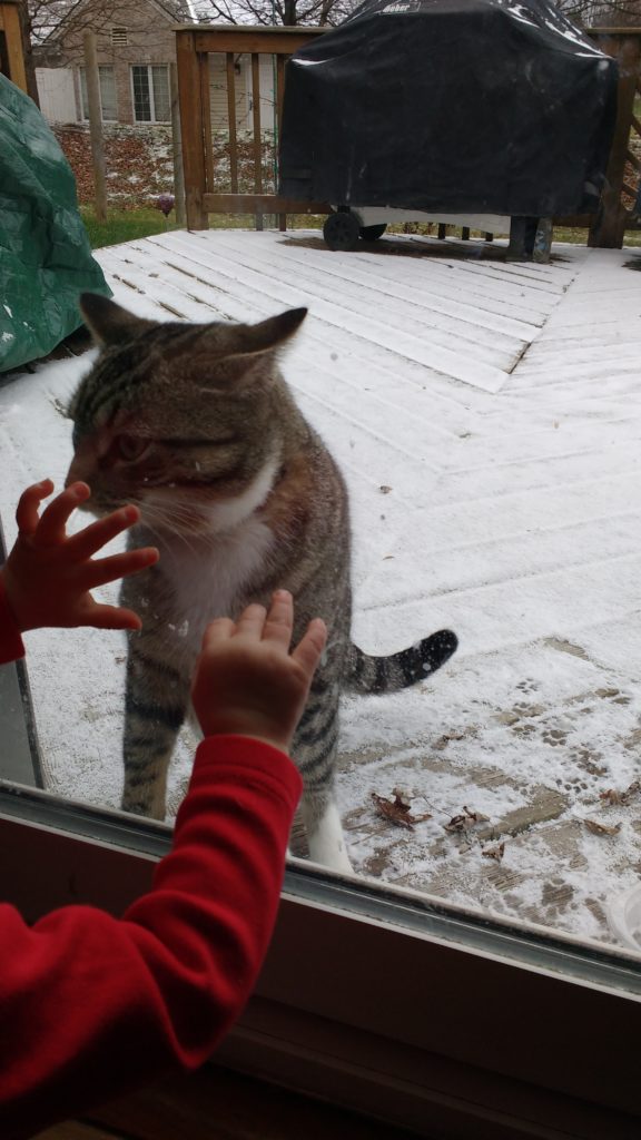 While we were making them, Rover (the cat that visits us from time to time) came to say hi. Autumn was pretty excited about it.