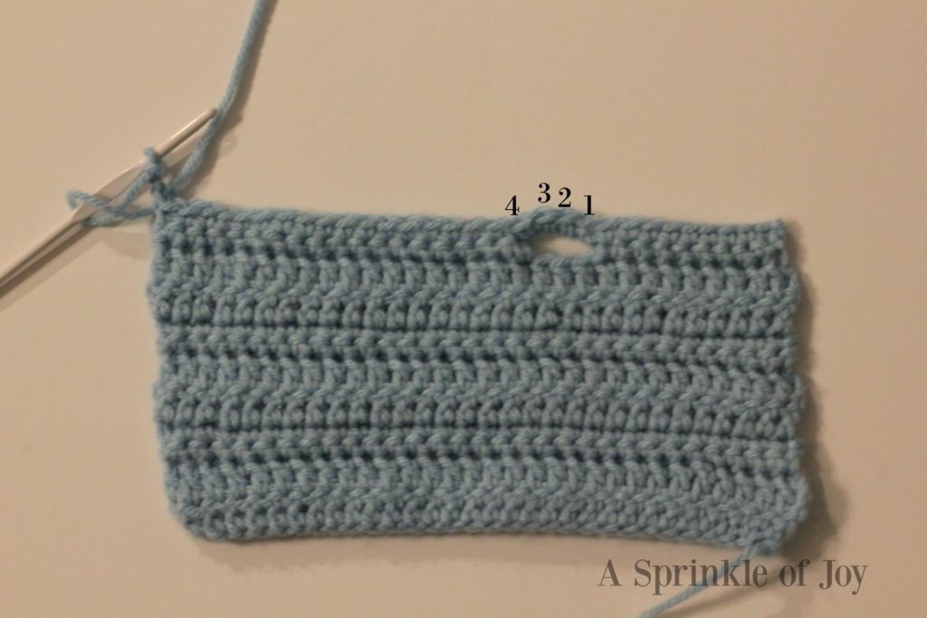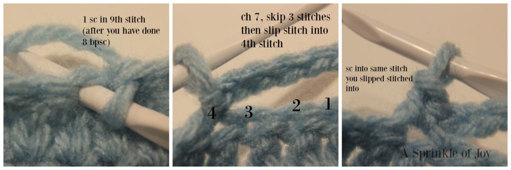Row 11: bpsc 9, 1 sc, ch 7, skip 3, slip stitch into next stitch, sc in same stitch you slipped stitched into, continue bpsc in the rest of the stitches. Ch 1 and turn.