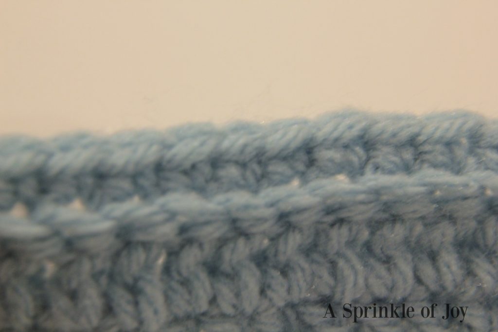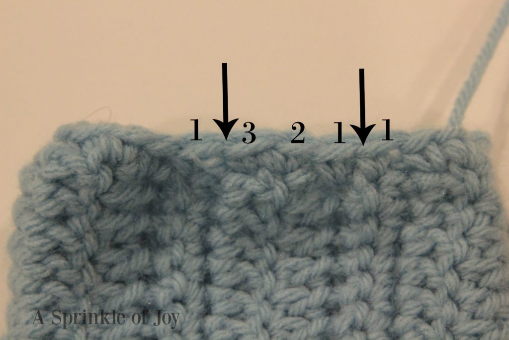 The way I did this was by working 1 sc into the pair of sc rows, then three stitches into the pair of dc rows. It’s hard to explain, and I hope the picture helps make it a little clearer.