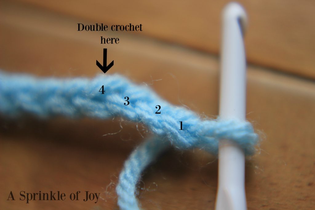 Row 1: in fourth ch from hook work a dc.