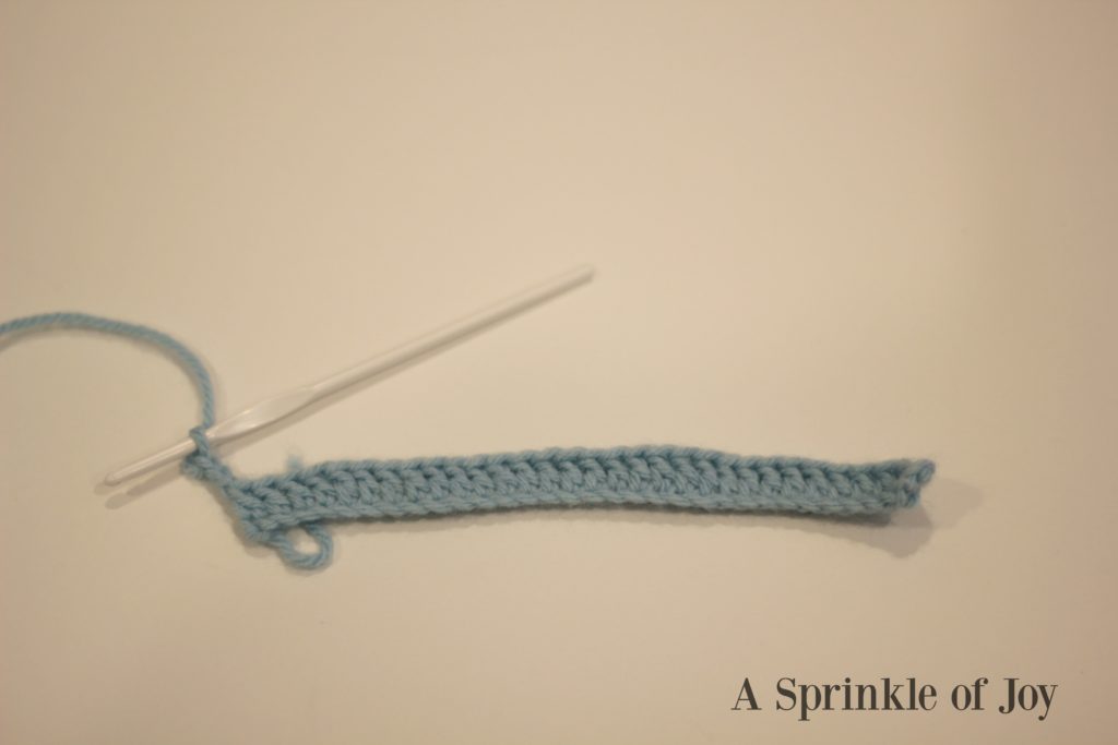 Row 1: dc in fourth chain from hook. Dc in each stitch. Chain 3 and turn [10]
