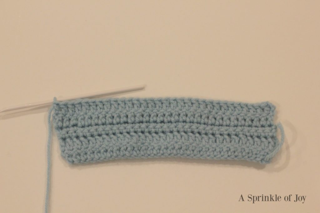After you have connected the sides together, you should have a long tube. Next up is adding the scalloped edges. To do this work 22 sc along the bottom of your band.