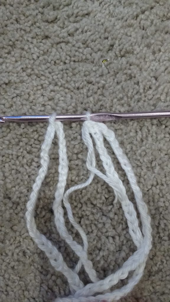 For example, for Annabelle a chain of 40 fits around Annabelle’s head. Two times that is a chain of 80. Â Take away a few chains (since it will stretch a little bit) makes it a chain of 75. Â So I’d make a chain of 75 for the headband.