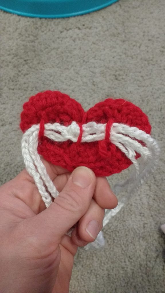 When cutting off, leave a slightly long string. Use this to create loops on the back of your heart. I suggest three places, in the middle and on the ends (you can see what I mean in the picture under putting it together).