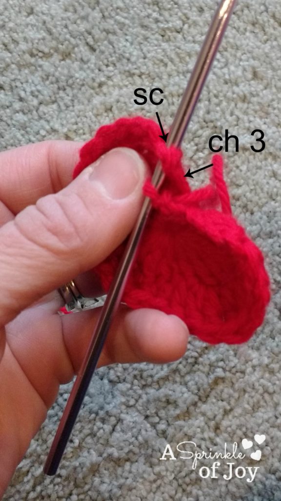 This is what it should look like after you have finished the 5 tr and 3 dc. Those stitches give you one side of the heart.