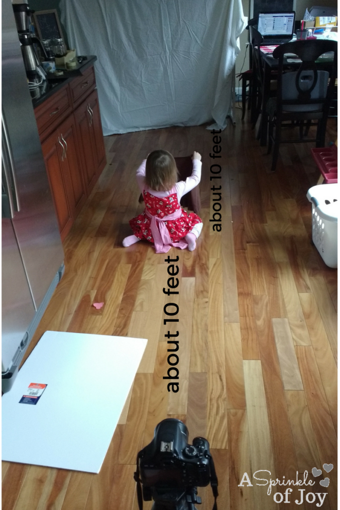 Set a backdrop up (I use a sheet), then your subject about 10 feet in front of that, then your camera about 10 feet in front of your subject. Â Then drape lights over the sheet (sorry, I already had started cleaning up when I realized I forgot to take a picture of the initial set up).