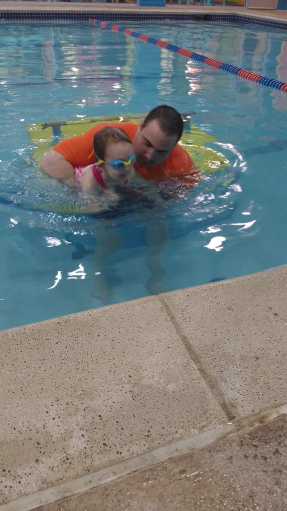 But now?  She will actually pull and kick towards her teacher, and she will put her face in the water.  Her teacher works so hard with her, and is so patient with Annabelle.  I don’t ever feel like he is pressuring her to do thing she isn’t ready to do yet.  Instead, he supports and encourages her, and it is working great.  It’s great seeing all the progress she has made, and watch her become more confident in her skills.