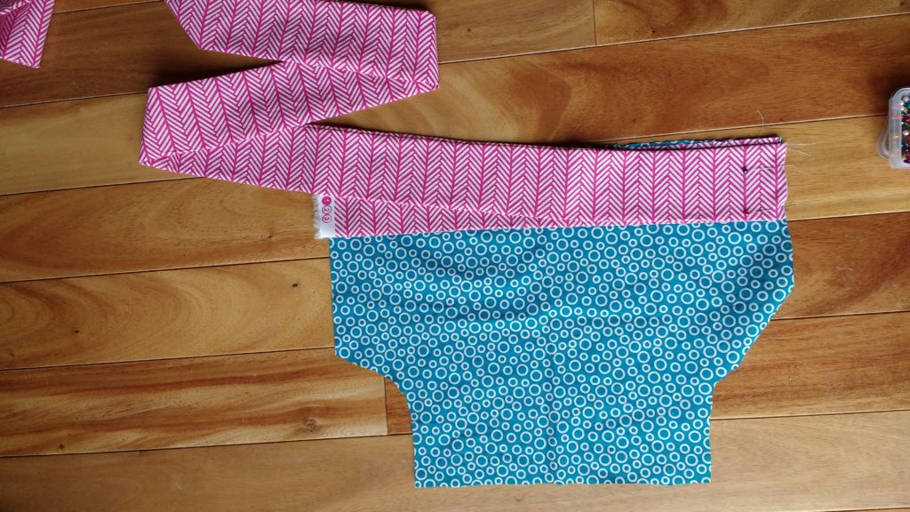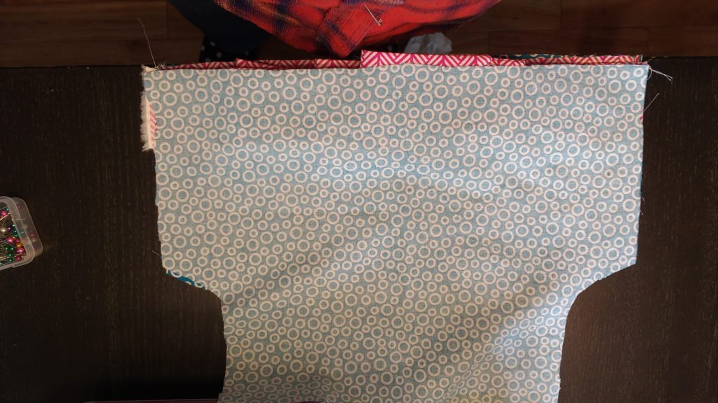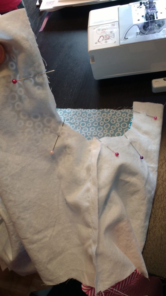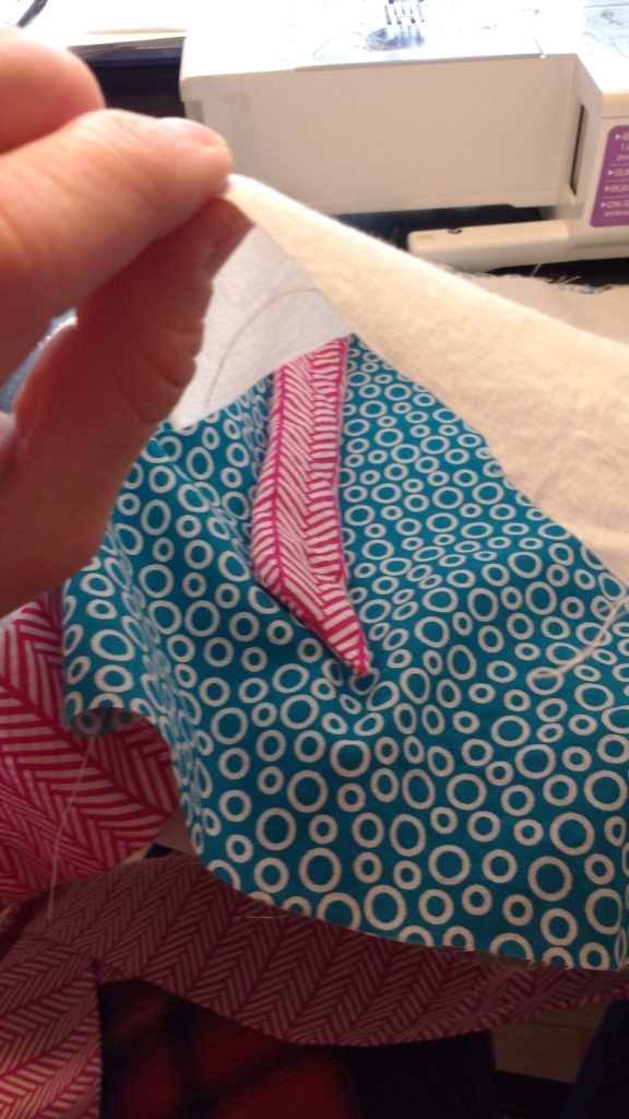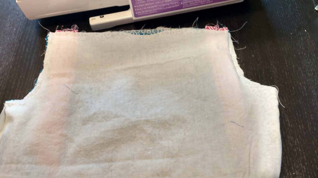 Now it’s time to sew the lining to the main fabric.  Put the two bodices so that their right sides are together.  I basically slip the main fabric into the lining.   Sew around both arm holes (not NOT across the top yet).