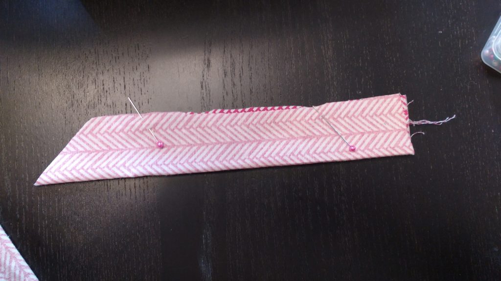 Take each back tie, and sew it with right sides together.  Be sure to leave the bottom open so you can turn it.