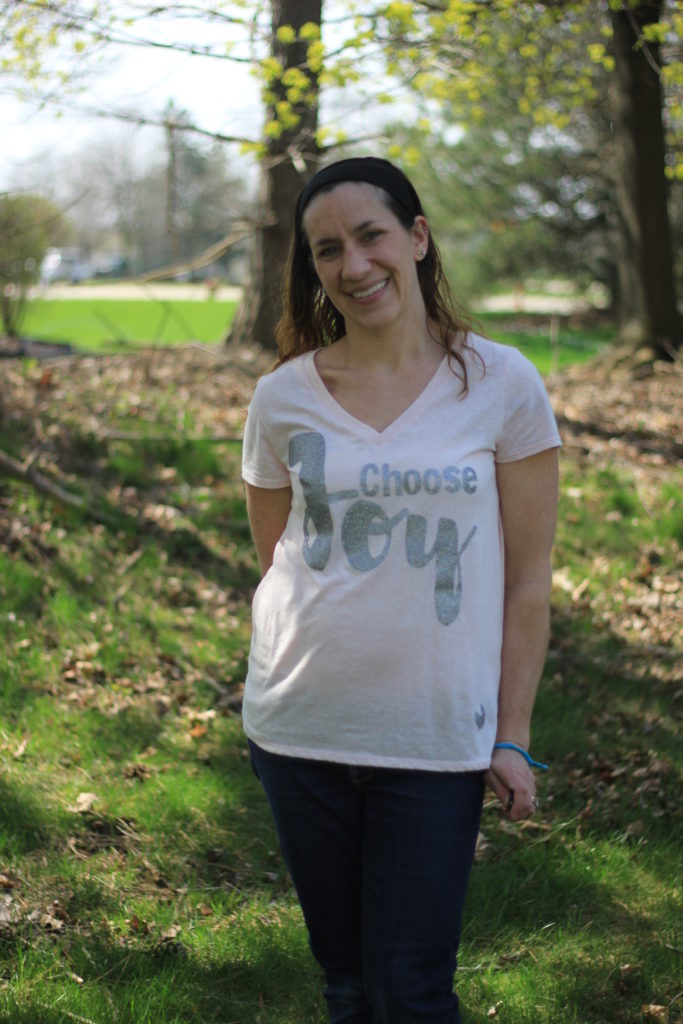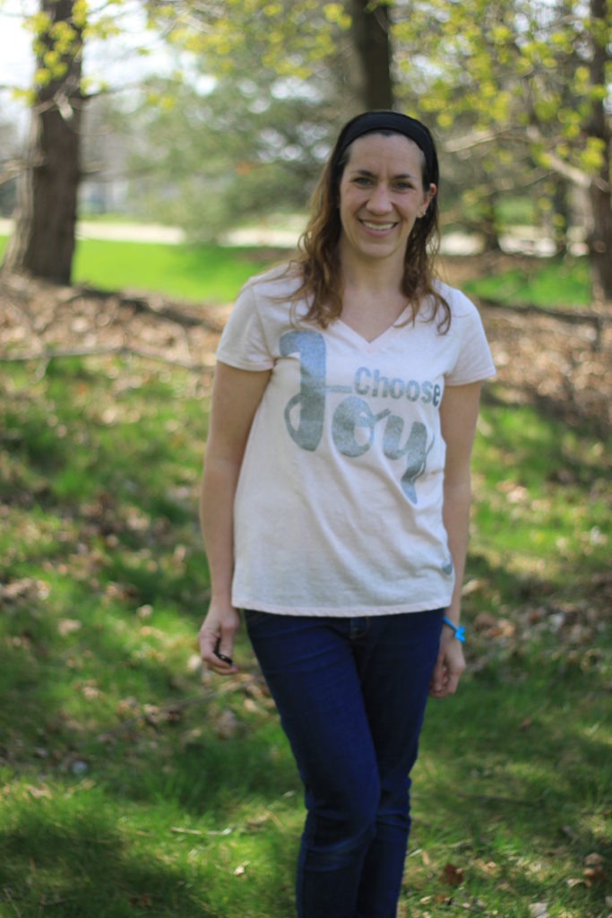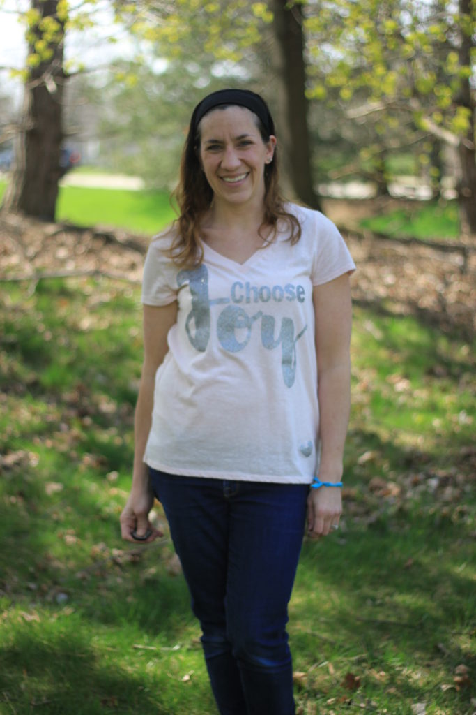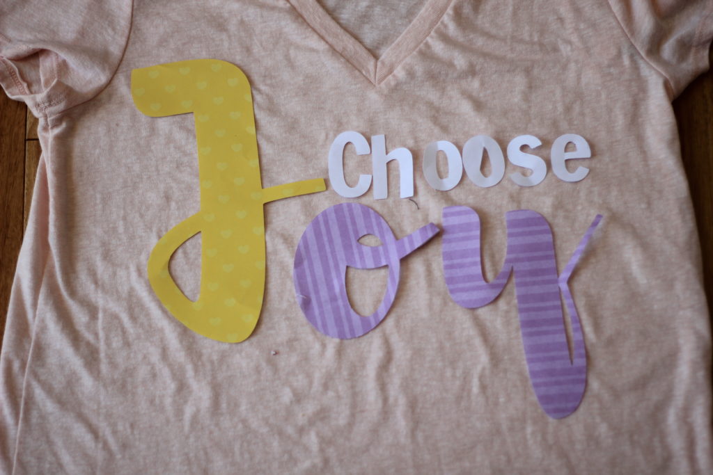 One of my goals the past few months has been to choose joy.  Last month I wrote this post after a particularly hard day.Right around that same time I snagged a cheap shirt from Target during one of my $10 Target challenge runs.  The shirt was plain, and I figured it would be a great shirt to do a little DIY with.  So, I decided to dabble with heat transfer vinyl and make a “choose joy” shirt.