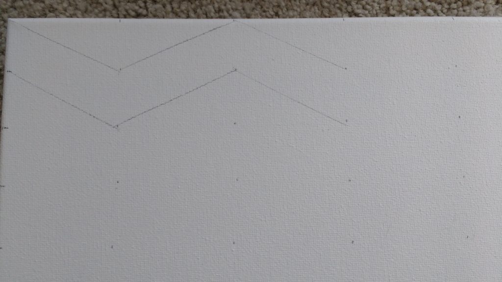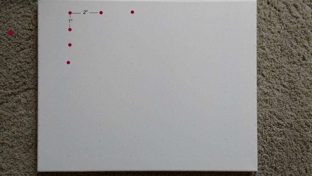 The first thing you need to do is make a grid on your canvas. You will want to make dots every 2″ across the 14″ side, and 1″ down the 11″ side. You wan’t to make the dots on the whole canvas. If you look close you can see them, I just made a few bigger to give you an idea of what I meant.