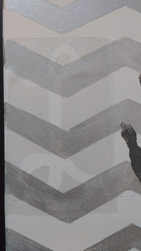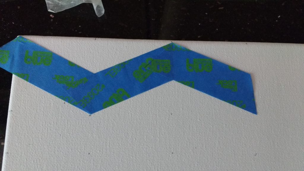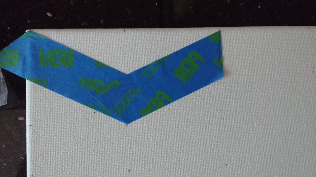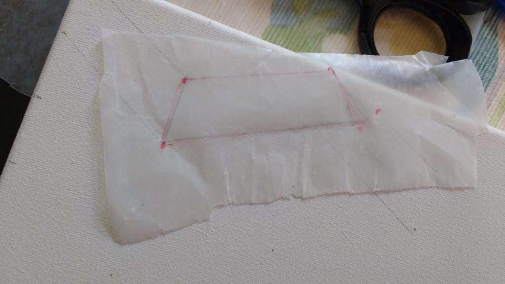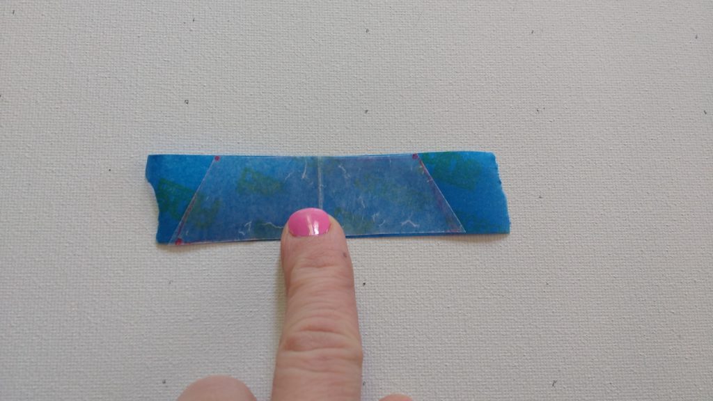 Now it’s time to cut out those pieces and start taping them on your canvas. This is sort of hard to explain, so I hope the pictures start. You start like this, with the trapezoid angling down. The corners match up with the dots you made.