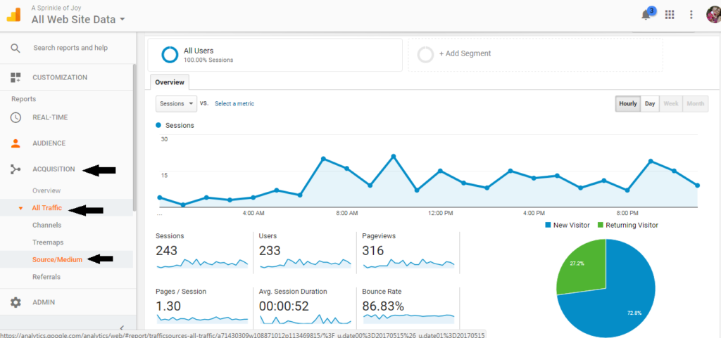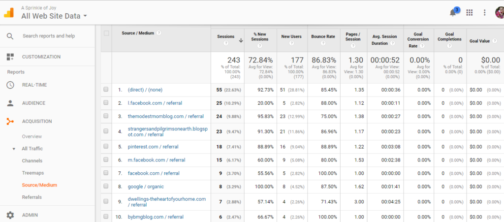 **Just a note.  If you look in the first column, you’ll see the number 277, and think but I thought the number was 316!?  When you view the source/medium they give you the  number of sessions, not pageviews.  This article does a good job of explaining the differences.**