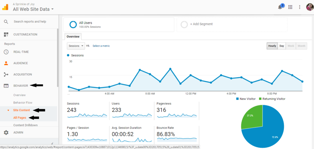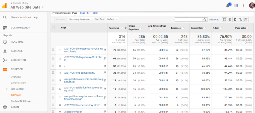 After looking at where my traffic was coming from, I decided to take a look at what pages received the highest amount of traffic.