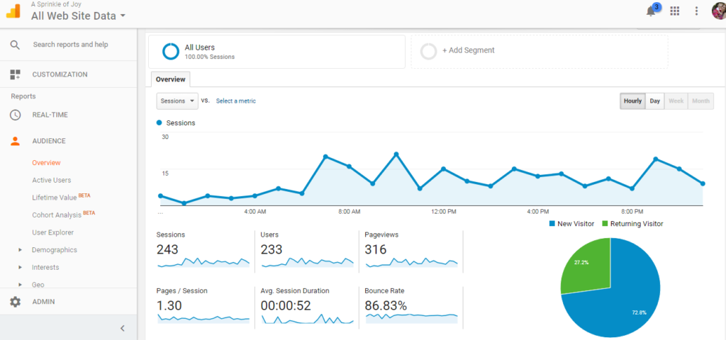 With this view, I can see when my traffic was coming to my blog. Â But I want more details! Â Where was it all coming from?! What posts where being viewed?! Â With GA, that is easy to figure out.