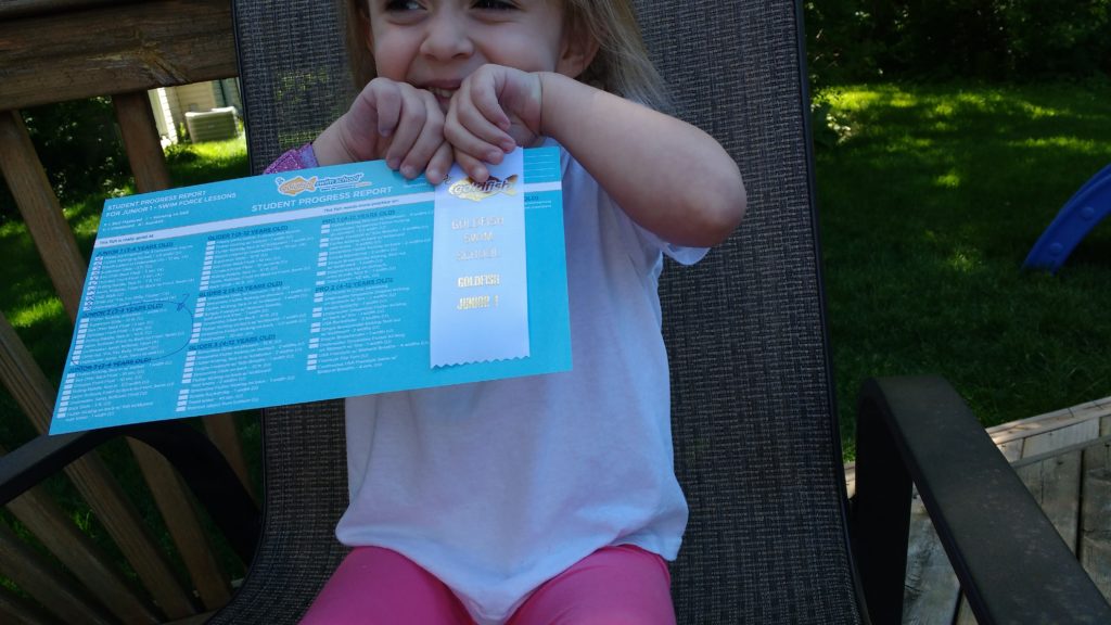 I mentioned last week in my Five on Friday post that Annabelle moved up a level at Goldfish, and I couldn’t be more proud. She was pretty proud of herself too. Although, I’m not sure if she was more excited about moving up, or the ribbon she got. 😉